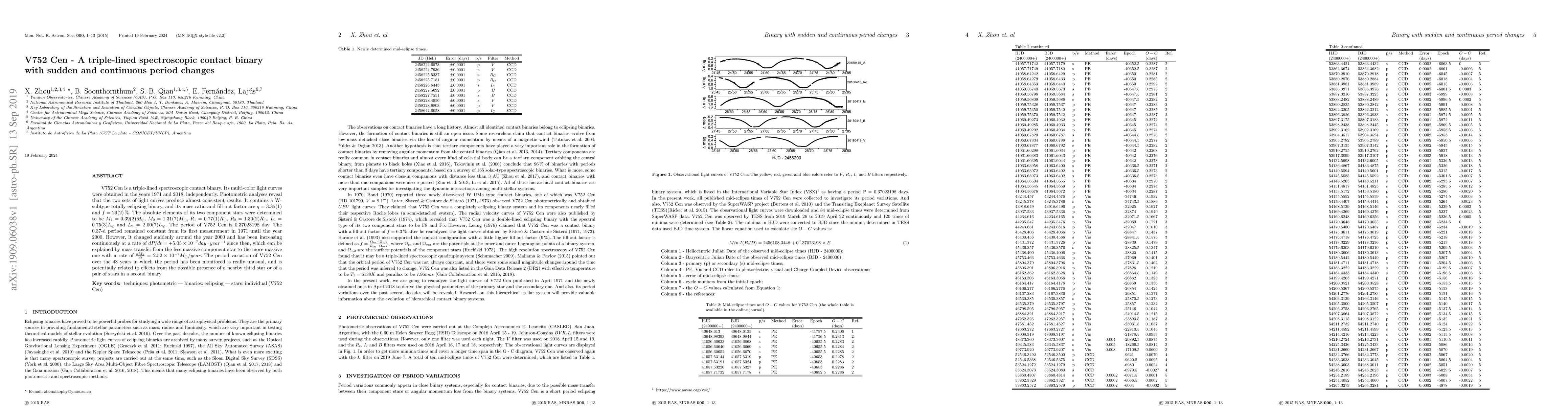 A triple-lined spectroscopic contact binary, V752 Cen, exhibits sudden and continuous period changes due to mass transfer between its two component stars, with implications for the presence of a nearby third star or another binary system.