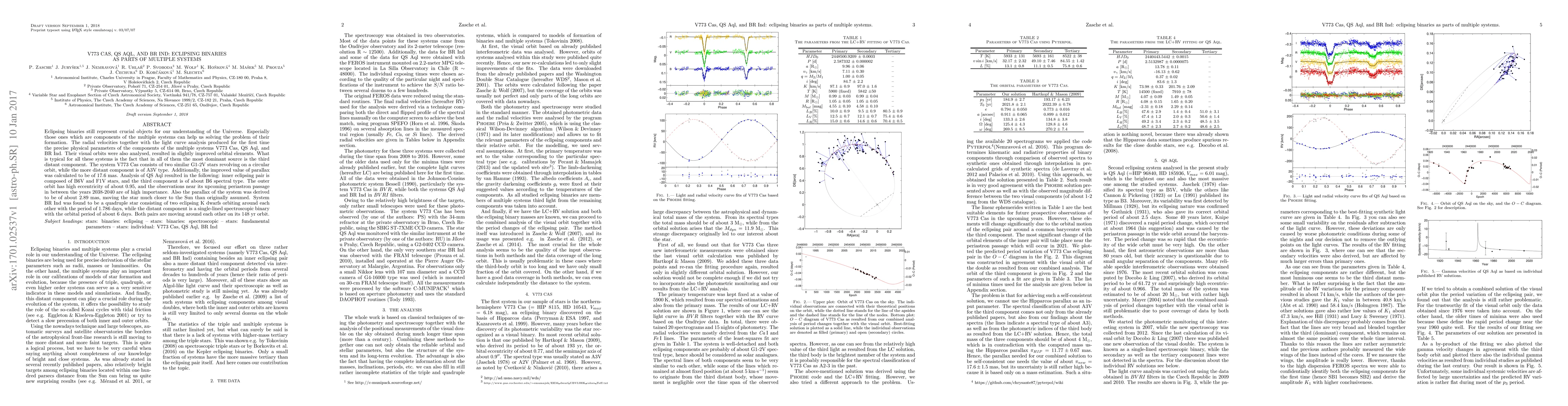 This paper analyzes the eclipsing binaries V773 Cas, QS Aql, and BR Ind, revealing their roles in multiple star systems. The study provides precise physical parameters and improved orbital elements, highlighting the influence of a third distant component in each system.