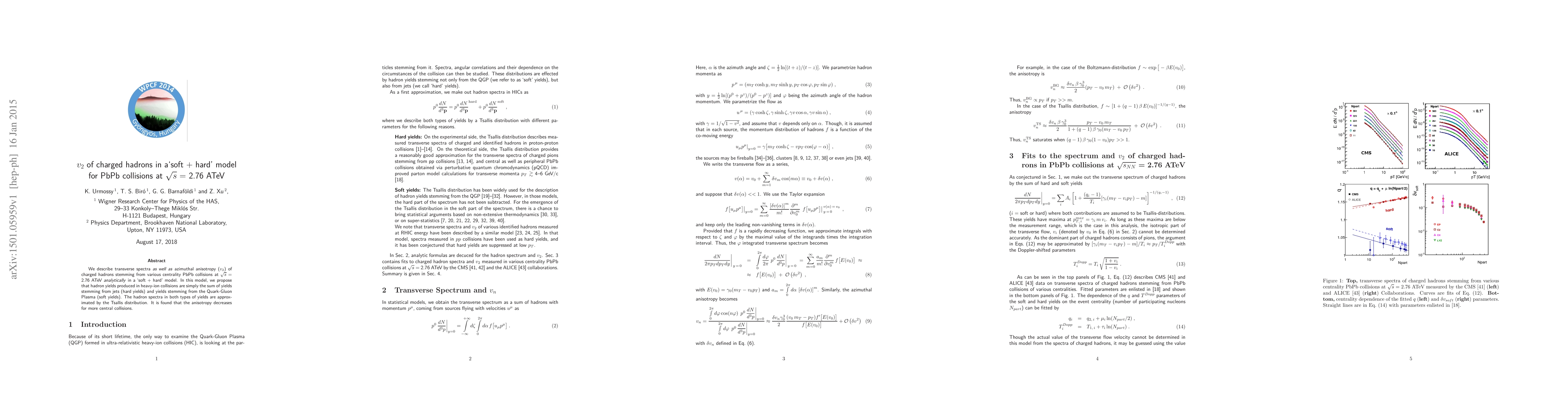 We describe transverse spectra as well as azimuthal anisotropy ($v_2$) of charged hadrons stemming from various centrality PbPb collisions at $\sqrt s$ = 2.76 ATeV analytically in a `soft + hard' model. In this model, we propose that hadron yields produced in heavy-ion collisions are simply the sum of yields stemming from jets (hard yields) and yields stemming from the Quark-Gluon Plasma (soft yields). The hadron spectra in both types of yields are approximated by the Tsallis distribution. It is found that the anisotropy decreases for more central collisions.