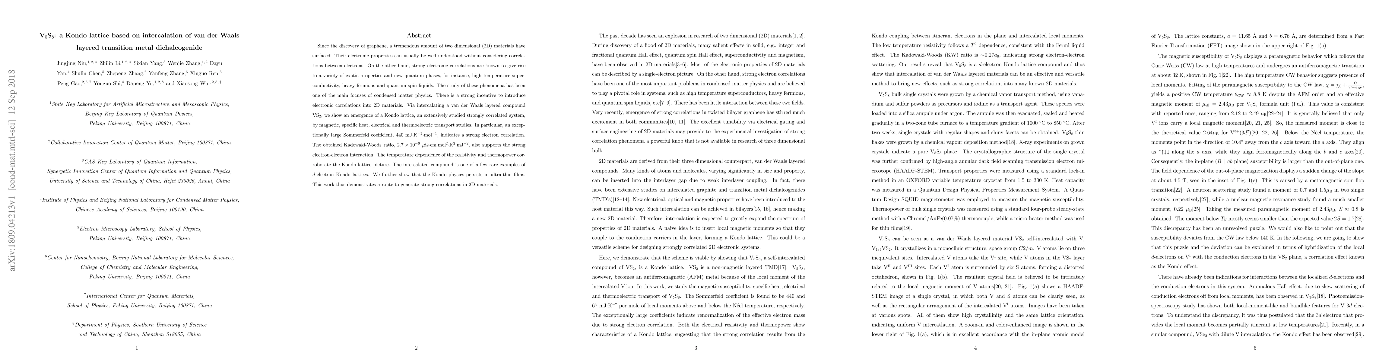Since the discovery of graphene, a tremendous amount of two dimensional (2D) materials have surfaced. Their electronic properties can usually be well understood without considering correlations between electrons. On the other hand, strong electronic correlations are known to give rise to a variety of exotic properties and new quantum phases, for instance, high temperature superconductivity, heavy fermions and quantum spin liquids. The study of these phenomena has been one of the main focuses of condensed matter physics. There is a strong incentive to introduce electronic correlations into 2D materials. Via intercalating a van der Waals layered compound VS$_2$, we show an emergence of a Kondo lattice, an extensively studied strongly correlated system, by magnetic, specific heat, electrical and thermoelectric transport studies. In particular, an exceptionally large Sommerfeld coefficient, 440 mJ$\cdot$K$^{-2}\cdot$mol$^{-1}$, indicates a strong electron correlation. The obtained Kadowaki-Woods ratio, $2.7\times 10^{-6}$ $\mu\Omega\cdot$cm$\cdot$mol$^2\cdot$K$^2\cdot$mJ$^{-2}$, also supports the strong electron-electron interaction. The temperature dependence of the resistivity and thermopower corroborate the Kondo lattice picture. The intercalated compound is one of a few rare examples of $d$-electron Kondo lattices. We further show that the Kondo physics persists in ultra-thin films. This work thus demonstrates a route to generate strong correlations in 2D materials.