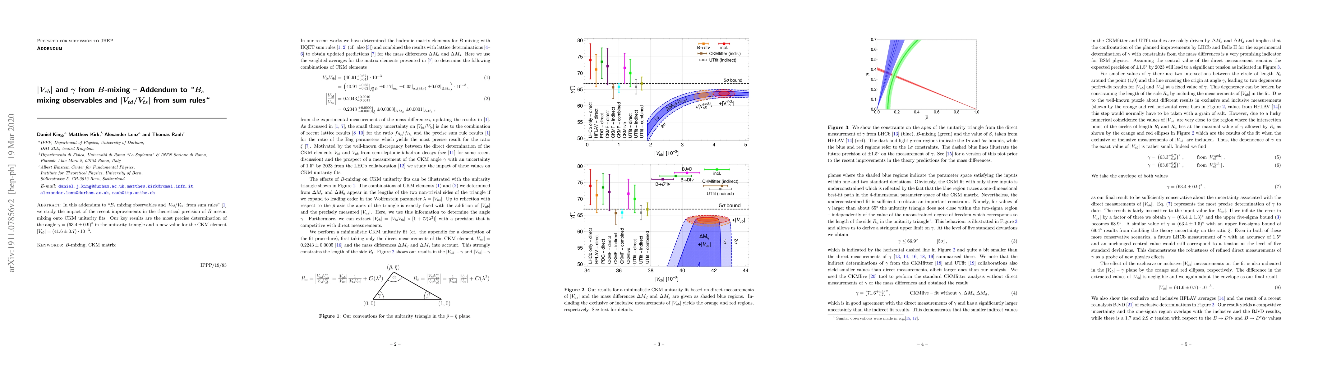 In this addendum to "$B_s$ mixing observables and $|V_{td}/V_{ts}|$ from sum rules" \cite{King:2019lal} we study the impact of the recent improvements in the theoretical precision of $B$ meson mixing onto CKM unitarity fits. Our key results are the most precise determination of the angle $\gamma = \left(63.4\pm0.9\right)^\circ$ in the unitarity triangle and a new value for the CKM element $|V_{cb}|=(41.6\pm0.7)\cdot10^{-3}$.