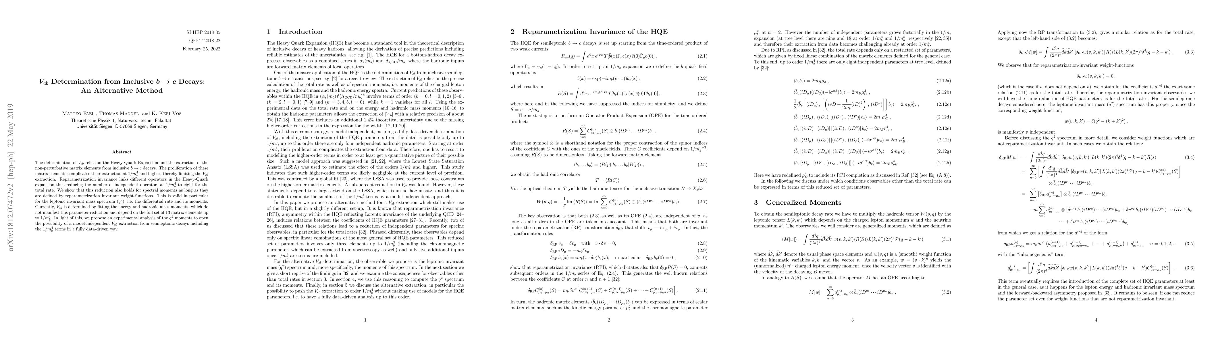 This paper proposes a new method for determining the $V_{cb}$ CKM matrix element by analyzing the leptonic invariant mass spectrum $q^2$ moments in inclusive $b \to c$ decays, leveraging reparametrization invariance to reduce the number of independent matrix elements needed. This approach aims to provide a more model-independent extraction of $V_{cb}$ that includes higher-order terms.