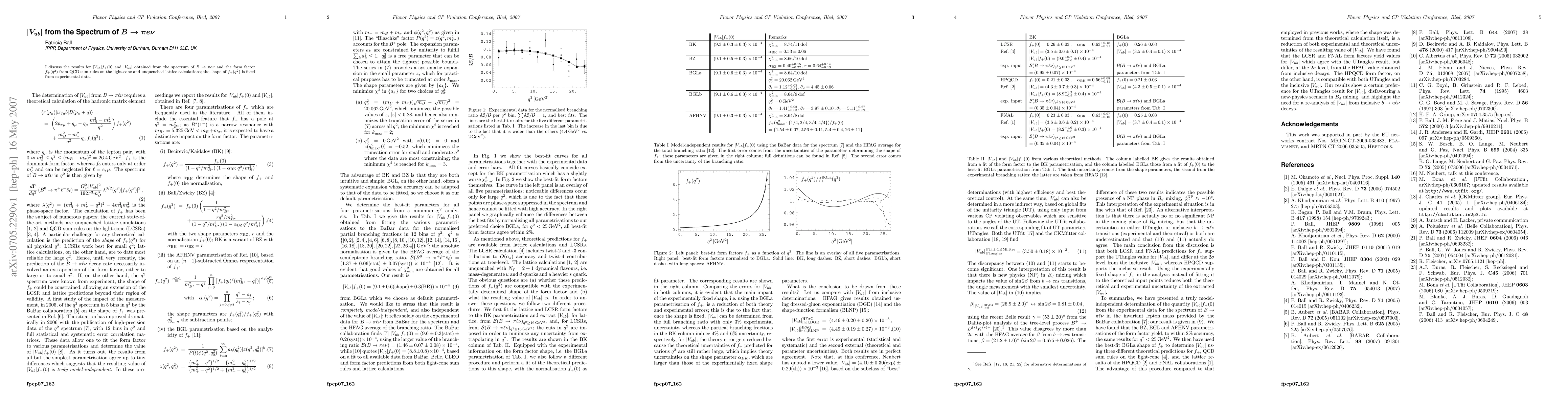 This paper presents results for $|V_{ub}|f_+(0)$ and $|V_{ub}|$ derived from the spectrum of $B\to\pi e \nu$, utilizing QCD sum rules and lattice calculations, with $f_+(q^2)$'s shape determined from experimental data.