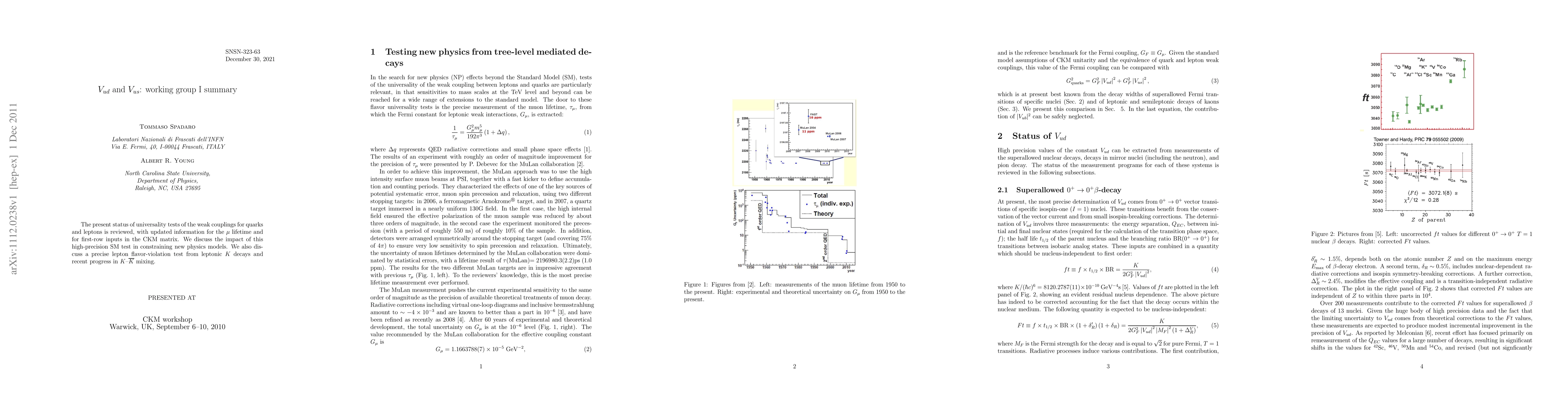 The present status of universality tests of the weak couplings for quarks and leptons is reviewed, with updated information for the muon lifetime and for first-row inputs in the CKM matrix. We discuss the impact of this high-precision SM test in constraining new physics models. We also discuss a precise lepton flavor-violation test from leptonic K decays and recent progress in K-Kbar mixing.
