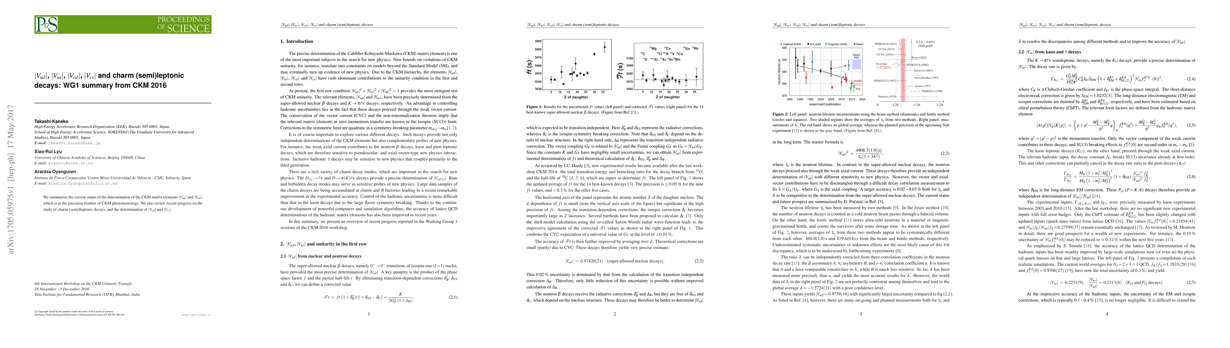 This paper summarizes current research on determining CKM matrix elements, particularly |V_ud| and |V_us|, with a focus on recent progress in charm (semi)leptonic decays.