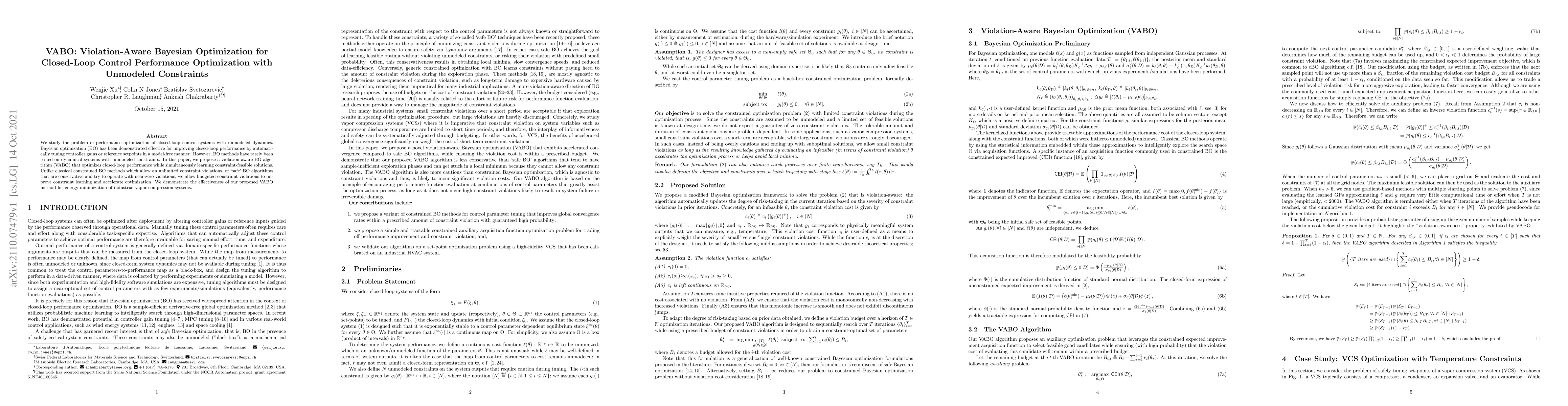 The paper proposes a Violation-Aware Bayesian Optimization (VABO) algorithm to optimize closed-loop control systems with unmodeled constraints, allowing budgeted violations to improve performance and accelerate learning. The method demonstrates effectiveness in minimizing energy for industrial vapor compression systems.