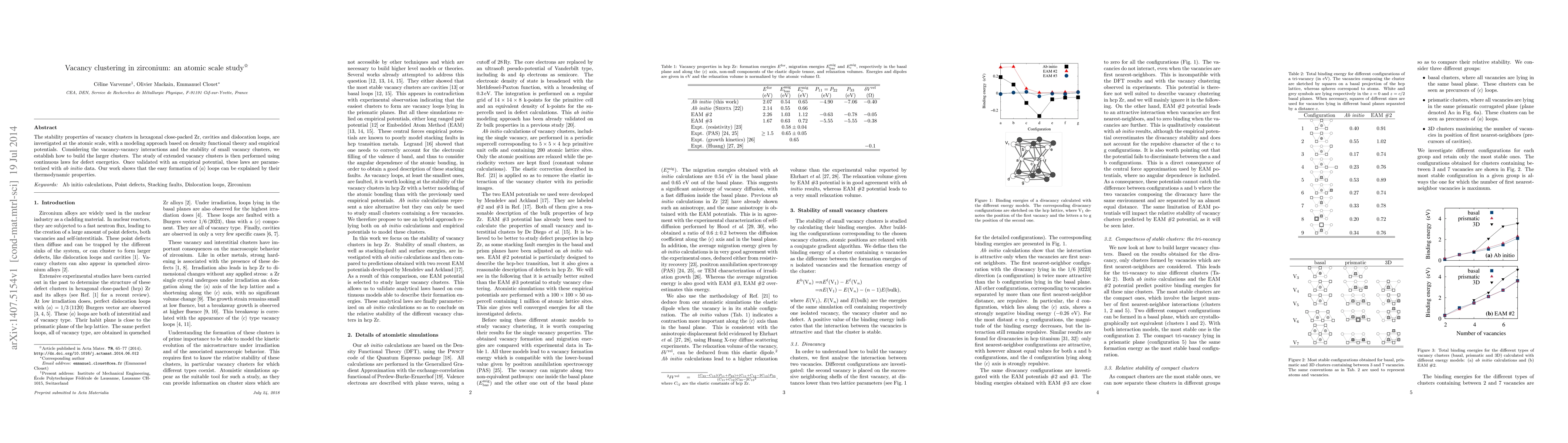 This study investigates the stability and formation of vacancy clusters in hexagonal close-packed zirconium using density functional theory and empirical potentials. The research establishes how small vacancy clusters form larger clusters and validates continuous laws for defect energetics, showing that the formation of dislocation loops is thermodynamically favorable.