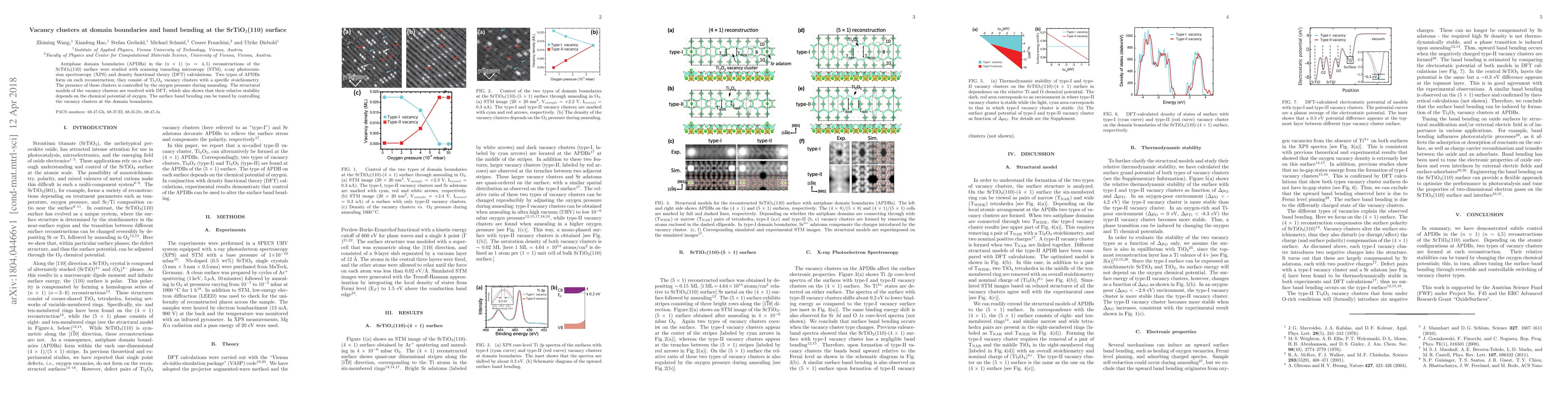 Antiphase domain boundaries (APDBs) in the ($n \times 1$)($n=4,5$) reconstructions of the SrTiO$_3$(110) surface were studied with scanning tunneling microscopy, x-ray photoemission spectroscopy, and density functional theory (DFT) calculations. Two types of APDBs form on each reconstruction; they consist of Ti$_x$O$_y$ vacancy clusters with a specific stoichiometry. The presence of these clusters is controlled by the oxygen pressure during annealing. The structural models of the vacancy clusters are resolved with DFT, which also shows that their relative stability depends on the chemical potential of oxygen. The surface band bending can be tuned by controlling the vacancy clusters at the domain boundaries.