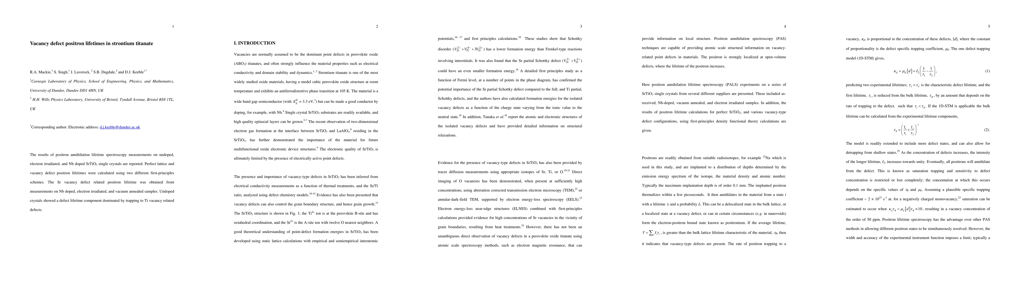 This study investigates vacancy defect positron lifetimes in strontium titanate (SrTiO3) using positron annihilation spectroscopy. Results reveal that undoped crystals exhibit a defect lifetime component primarily due to Ti vacancy defects, while Nb doping and electron irradiation introduce Sr vacancy defects.