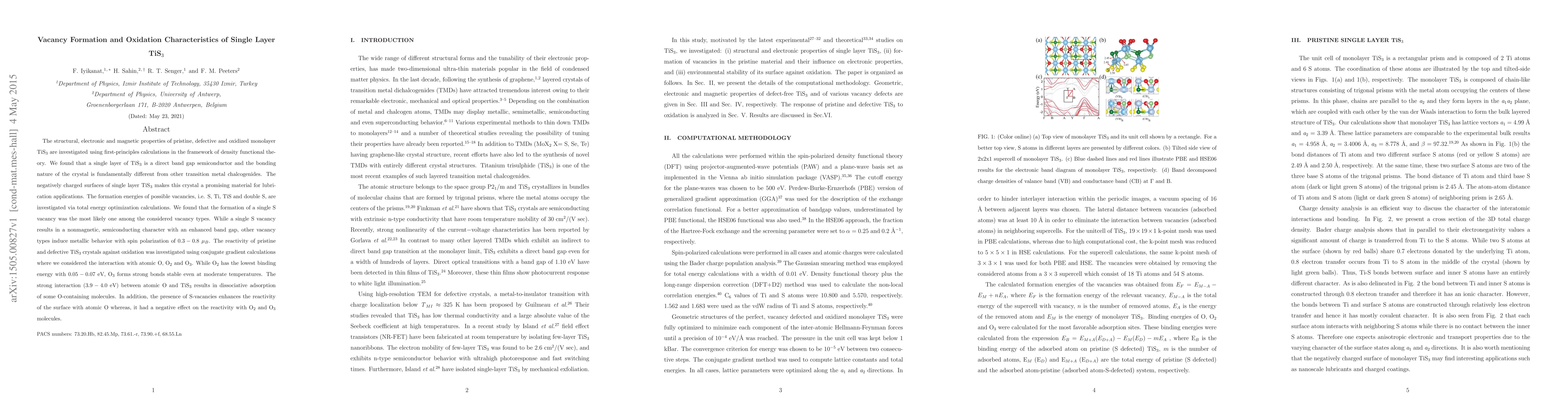 This paper investigates the vacancy formation and oxidation characteristics of monolayer TiS3 using density functional theory. It finds that a single S vacancy enhances the band gap while other vacancies induce metallic behavior with spin polarization. The study also reveals that O2 binds weakly, whereas O3 forms strong, stable bonds, and the presence of S-vacancies increases reactivity with O but decreases it with O2 and O3.