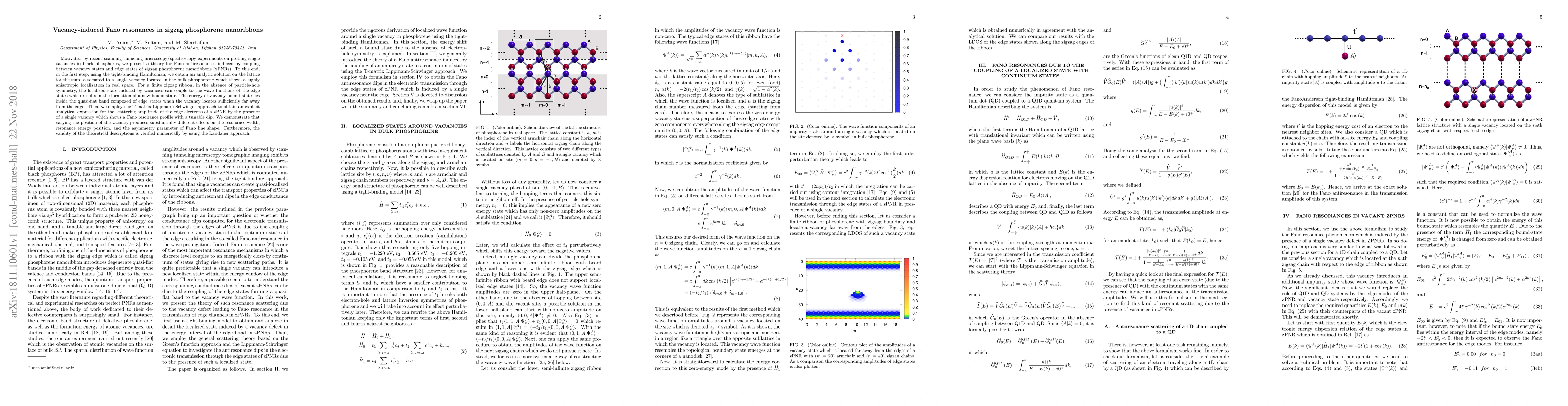 Researchers discovered Fano resonances in zigzag phosphorene nanoribbons caused by vacancies, with varying effects on resonance width and energy position depending on the vacancy's location.