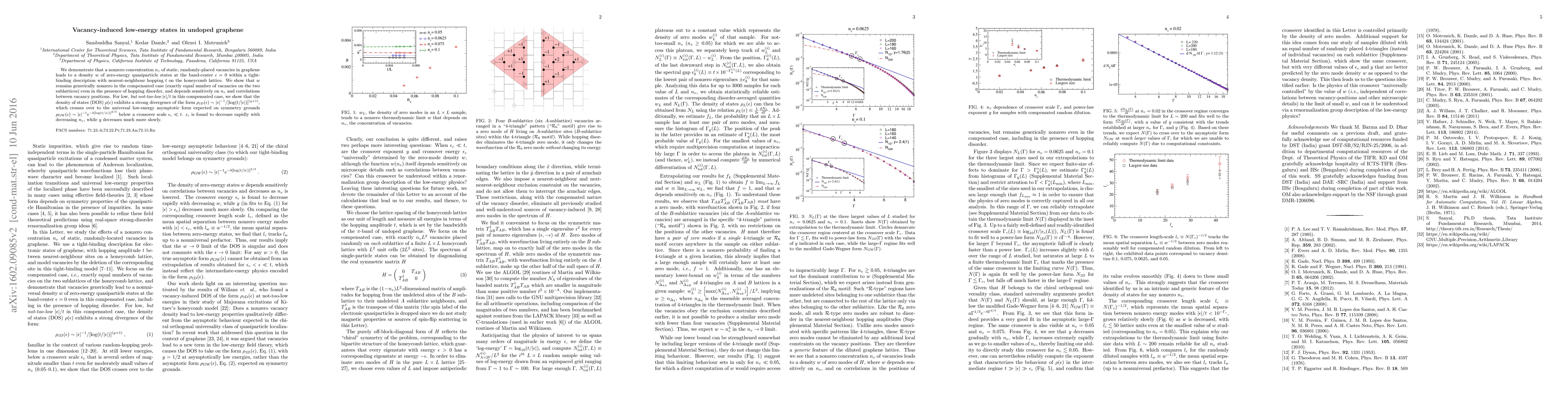 This paper investigates how vacancies in undoped graphene create low-energy states, showing that even with equal numbers of vacancies on both sublattices, a nonzero density of zero-energy quasiparticle states persists. The density of states exhibits a strong divergence at low energies, transitioning to a universal form as energy decreases further.