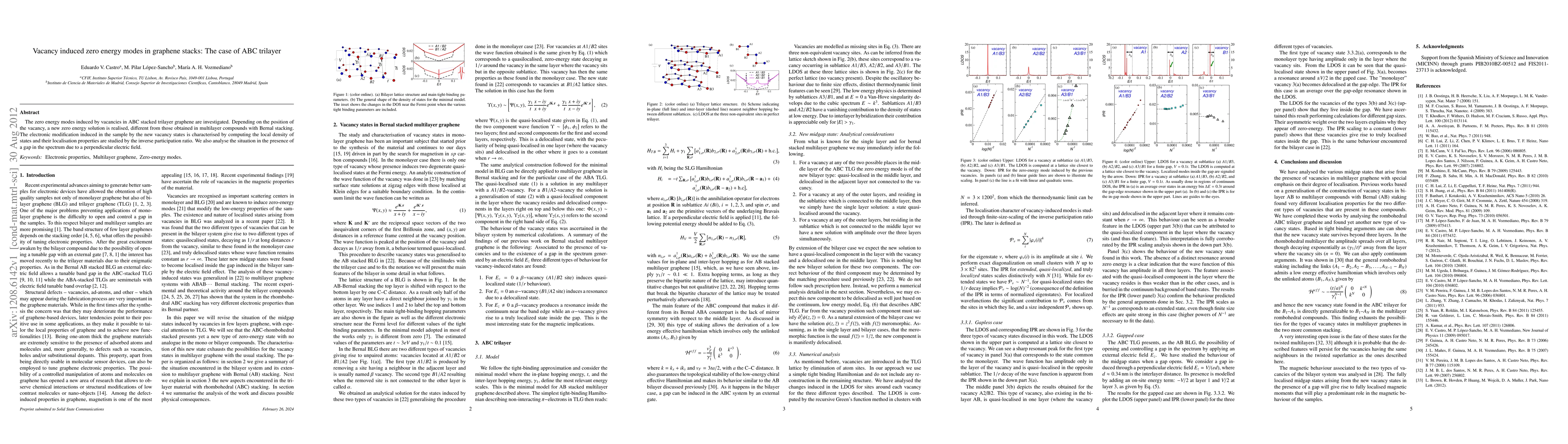 Summary: This study investigates zero energy modes in ABC trilayer graphene stacks caused by vacancies, revealing unique electronic modifications. The local density of states and inverse participation ratio are analyzed to understand the localization properties, with additional analysis under an electric field inducing a gap in the spectrum.