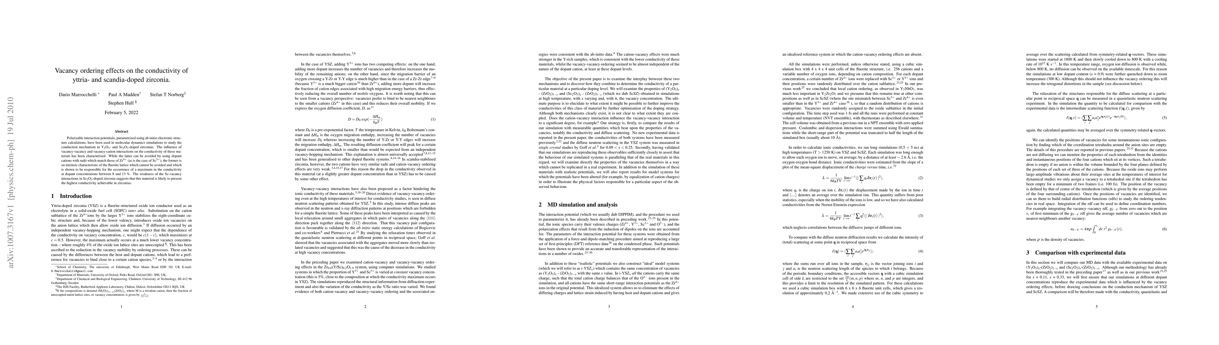This study uses molecular dynamics simulations to investigate the impact of vacancy ordering on the conductivity of yttria- and scandia-doped zirconia, revealing that vacancy-vacancy interactions are intrinsic to the fluorite lattice and cause a conductivity peak at dopant concentrations of 8-13%. Scandia doping, with its weak vacancy interactions, suggests the highest conductivity potential in zirconia materials.