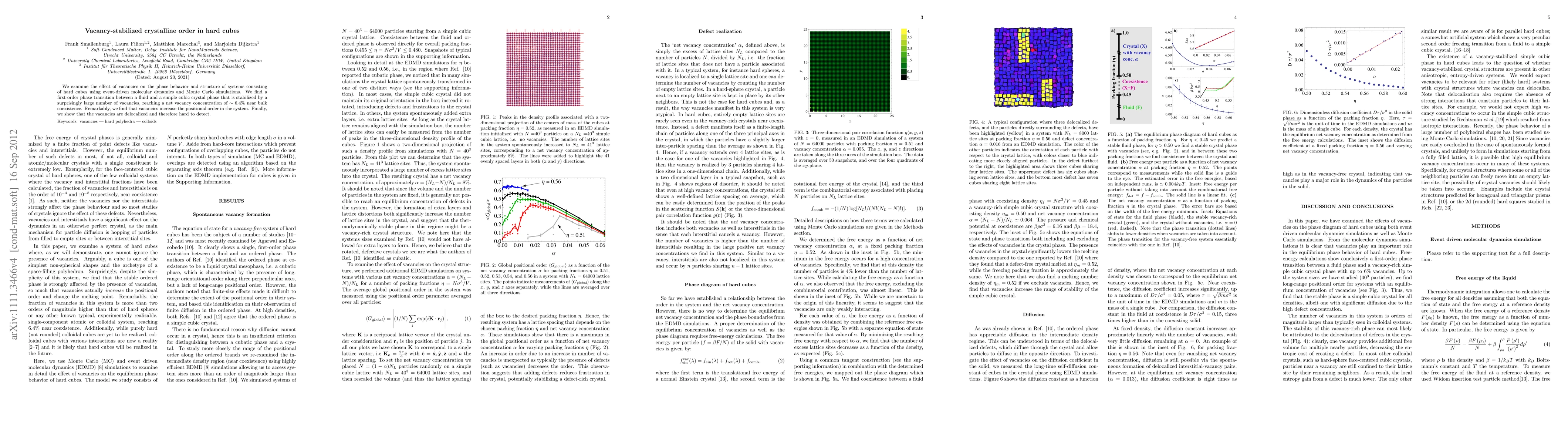 We examine the effect of vacancies on the phase behavior and structure of systems consisting of hard cubes using event-driven molecular dynamics and Monte Carlo simulations. We find a first-order phase transition between a fluid and a simple cubic crystal phase that is stabilized by a surprisingly large number of vacancies, reaching a net vacancy concentration of ~6.4% near bulk coexistence. Remarkably, we find that vacancies increase the positional order in the system. Finally, we show that the vacancies are delocalized and therefore hard to detect.
