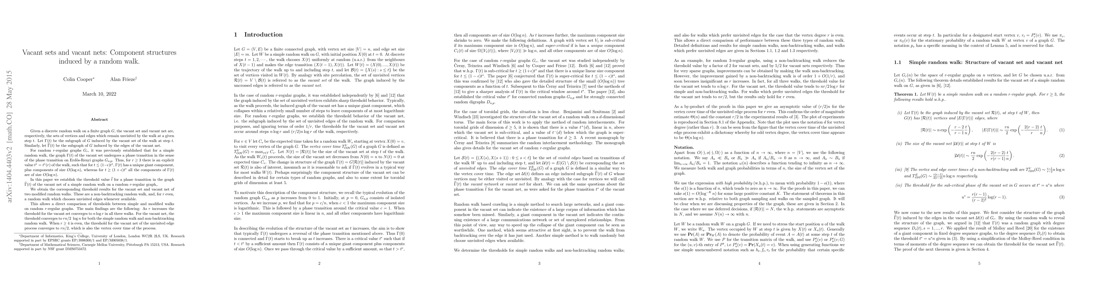 Given a discrete random walk on a finite graph $G$, the vacant set and vacant net are, respectively, the sets of vertices and edges which remain unvisited by the walk at a given step $t$.%These sets induce subgraphs of the underlying graph. Let $\Gamma(t)$ be the subgraph of $G$ induced by the vacant set of the walk at step $t$. Similarly, let $\widehat \Gamma(t)$ be the subgraph of $G$ induced by the edges of the vacant net. For random $r$-regular graphs $G_r$, it was previously established that for a simple random walk, the graph $\Gamma(t)$ of the vacant set undergoes a phase transition in the sense of the phase transition on Erd\H{os}-Renyi graphs $G_{n,p}$. Thus, for $r \ge 3$ there is an explicit value $t^*=t^*(r)$ of the walk, such that for $t\leq (1-\epsilon)t^*$, $\Gamma(t)$ has a unique giant component, plus components of size $O(\log n)$, whereas for $t\geq (1+\epsilon)t^*$ all the components of $\Gamma(t)$ are of size $O(\log n)$. We establish the threshold value $\widehat t$ for a phase transition in the graph $\widehat \Gamma(t)$ of the vacant net of a simple random walk on a random $r$-regular graph. We obtain the corresponding threshold results for the vacant set and vacant net of two modified random walks. These are a non-backtracking random walk, and, for $r$ even, a random walk which chooses unvisited edges whenever available. This allows a direct comparison of thresholds between simple and modified walks on random $r$-regular graphs. The main findings are the following: As $r$ increases the threshold for the vacant set converges to $n \log r$ in all three walks. For the vacant net, the threshold converges to $rn/2 \; \log n$ for both the simple random walk and non-backtracking random walk. When $r\ge 4$ is even, the threshold for the vacant net of the unvisited edge process converges to $rn/2$, which is also the vertex cover time of the process.