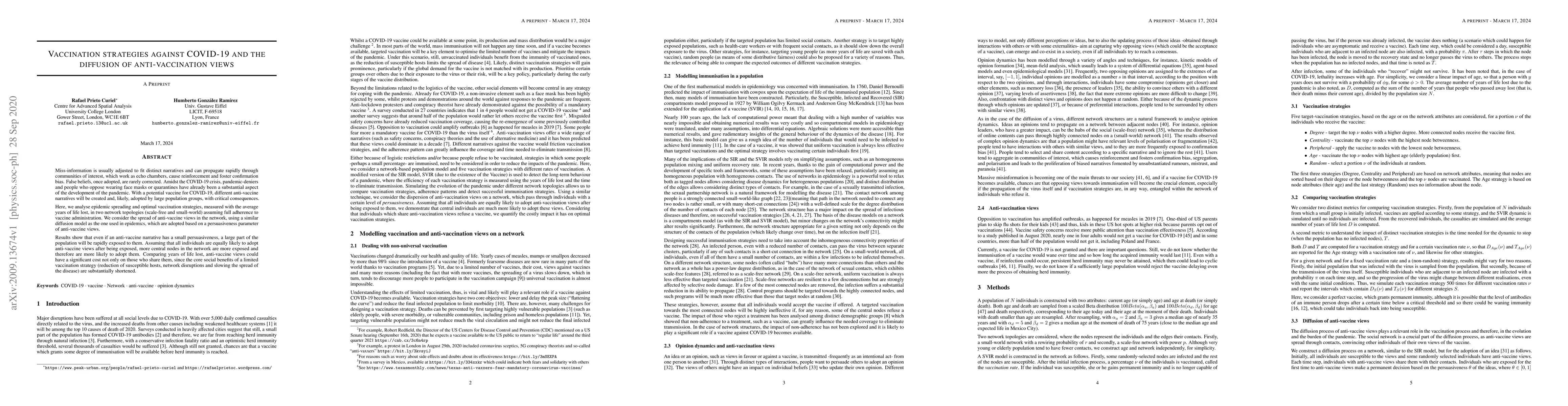 Miss-information is usually adjusted to fit distinct narratives and can propagate rapidly through communities of interest, which work as echo chambers, cause reinforcement and foster confirmation bias. False beliefs, once adopted, are rarely corrected. Amidst the COVID-19 crisis, pandemic-deniers and people who oppose wearing face masks or quarantines have already been a substantial aspect of the development of the pandemic. With a potential vaccine for COVID-19, different anti-vaccine narratives will be created and, likely, adopted by large population groups, with critical consequences. Here, we analyse epidemic spreading and optimal vaccination strategies, measured with the average years of life lost, in two network topologies (scale-free and small-world) assuming full adherence to vaccine administration. We consider the spread of anti-vaccine views in the network, using a similar diffusion model as the one used in epidemics, which are adopted based on a persuasiveness parameter of anti-vaccine views. Results show that even if an anti-vaccine narrative has a small persuasiveness, a large part of the population will be rapidly exposed to them. Assuming that all individuals are equally likely to adopt anti-vaccine views after being exposed, more central nodes in the network are more exposed and therefore are more likely to adopt them. Comparing years of life lost, anti-vaccine views could have a significant cost not only on those who share them, since the core social benefits of a limited vaccination strategy (reduction of susceptible hosts, network disruptions and slowing the spread of the disease) are substantially shortened.