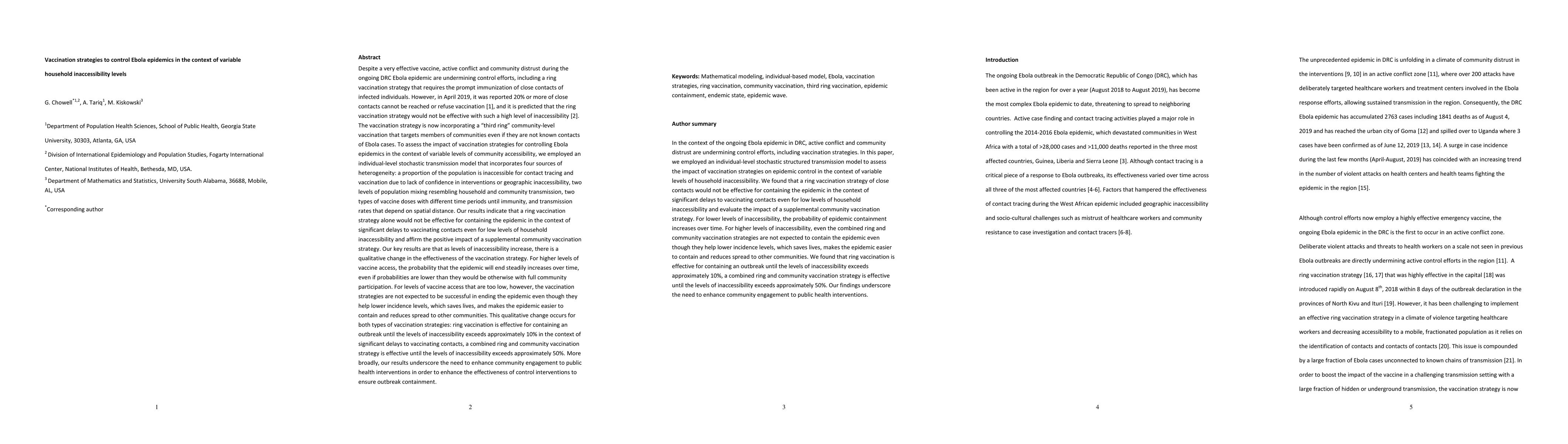 This paper evaluates the efficacy of vaccination strategies for controlling Ebola epidemics in the Democratic Republic of Congo, considering variable household inaccessibility. It finds that while ring vaccination is effective for low inaccessibility, combined ring and community vaccination strategies are needed to manage higher levels, emphasizing the importance of community engagement.
