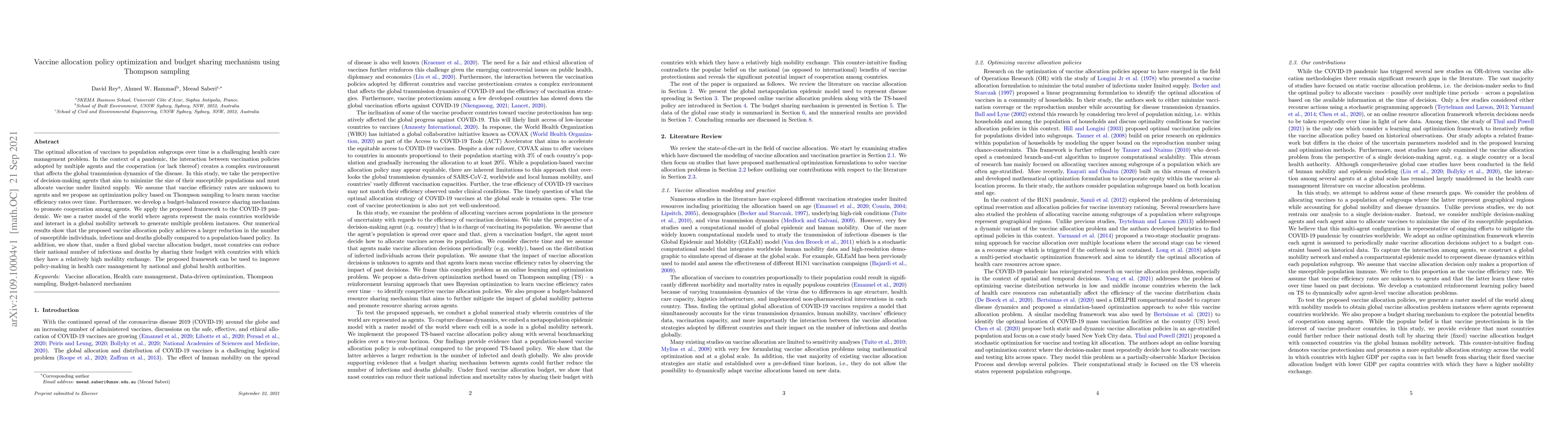 This study optimizes vaccine allocation policy using Thompson sampling to minimize susceptible populations during a pandemic, achieving better global outcomes than traditional population-based policies. It also proposes budget-balanced resource sharing to promote cooperation among countries.