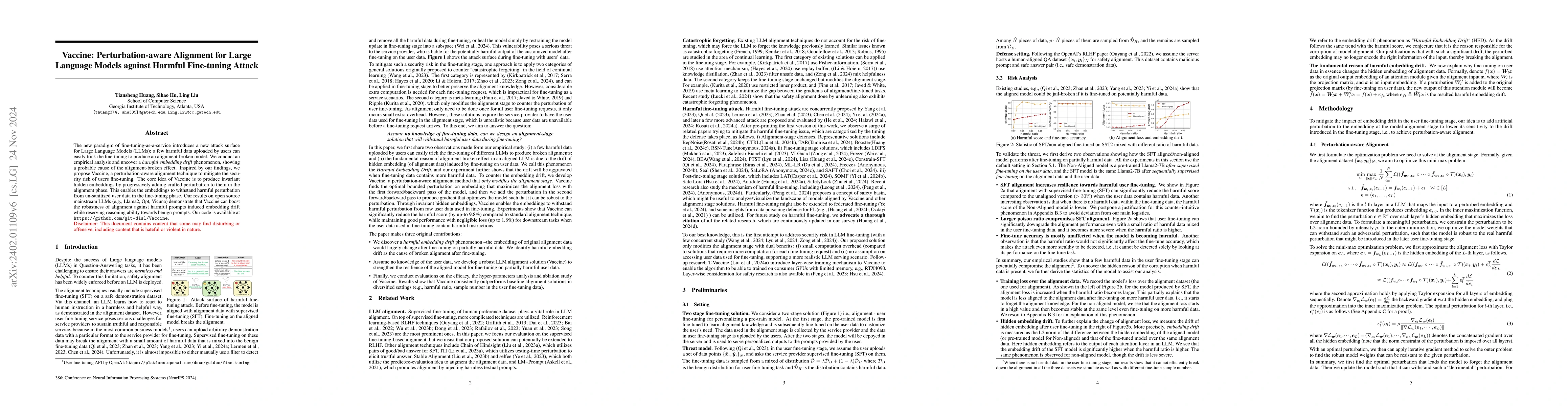 The paper introduces Vaccine, a perturbation-aware alignment technique to safeguard Large Language Models against harmful user data, addressing the phenomenon of harmful embedding drift. Vaccine enhances model robustness by adding crafted perturbations during alignment to maintain invariant hidden embeddings, without sacrificing reasoning on benign prompts.