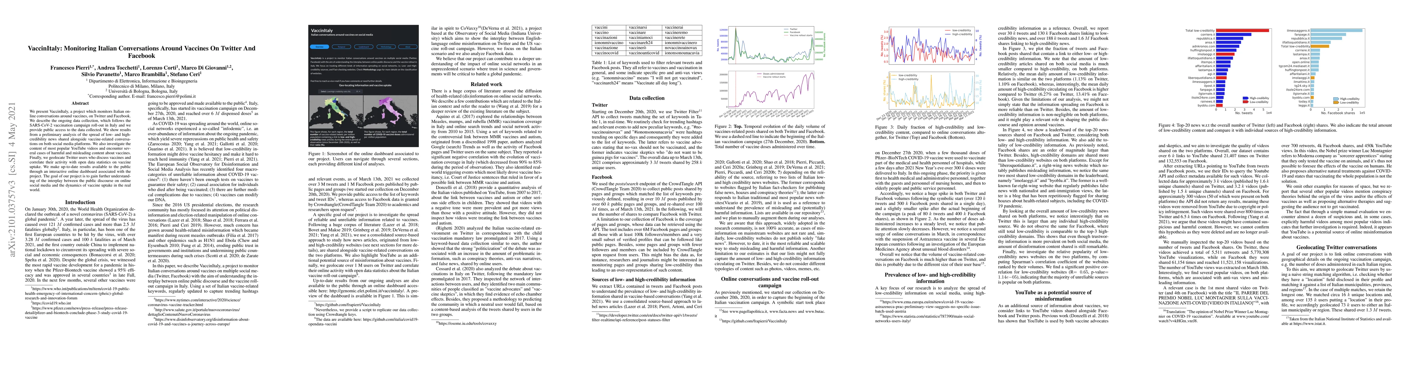 VaccinItaly monitors Italian vaccine-related conversations on Twitter and Facebook, analyzing the spread of credible and misleading news, and correlating social media activity with real-world vaccine uptake statistics. The project aims to understand the relationship between online discourse and vaccination dynamics.