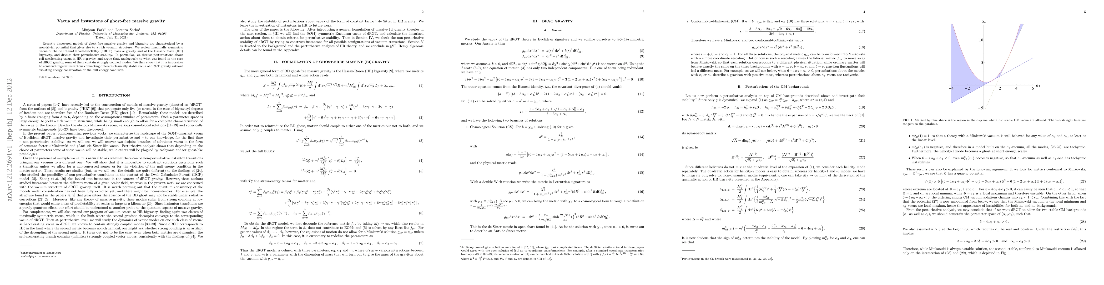 This paper reviews the vacuum structures and stability of ghost-free massive gravity and bigravity models, focusing on the de Rham-Gabadadze-Tolley (dRGT) and Hassan-Rosen (HR) formulations. It finds that some self-accelerating vacua in HR bigravity contain strongly coupled modes, and concludes that regular instantons connecting different vacua in dRGT gravity violate energy conservation or the null energy condition.
