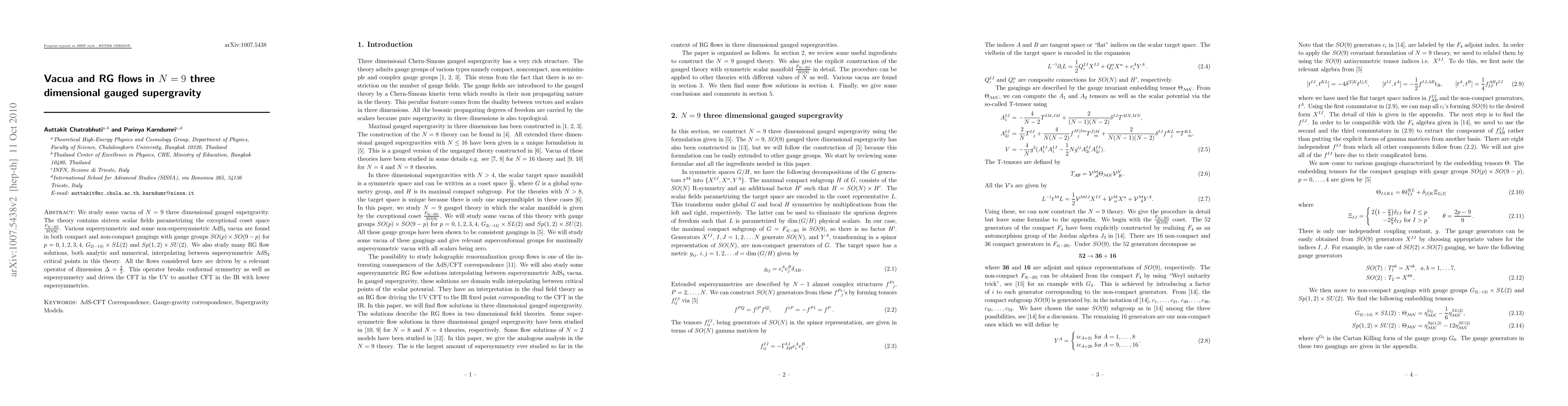 We study some vacua of N=9 three dimensional gauged supergravity. The theory contains sixteen scalar fields parametrizing the exceptional coset space ${F_{4(-20)}}{SO(9)}$. Various AdS supersymmetric and some non-supersymmetric vacua are found in both compact and non-compact gaugings with gauge groups $SO(p)\times SO(9-p)$ for $p=0, 1, 2, 3, 4$, $G_{2(-14)}\times SL(2)$ and $Sp(1,2)\times SU(2)$. We also study many RG flow solutions, both analytic and numerical, interpolating between supersymmetric critical points in this theory. All the flows considered here are driven by a relevant operator of dimension $\Delta={3}{2}$. This operator breaks conformal symmetry as well as supersymmetry and drives the CFT in the UV to another CFT in the IR with lower supersymmetries.