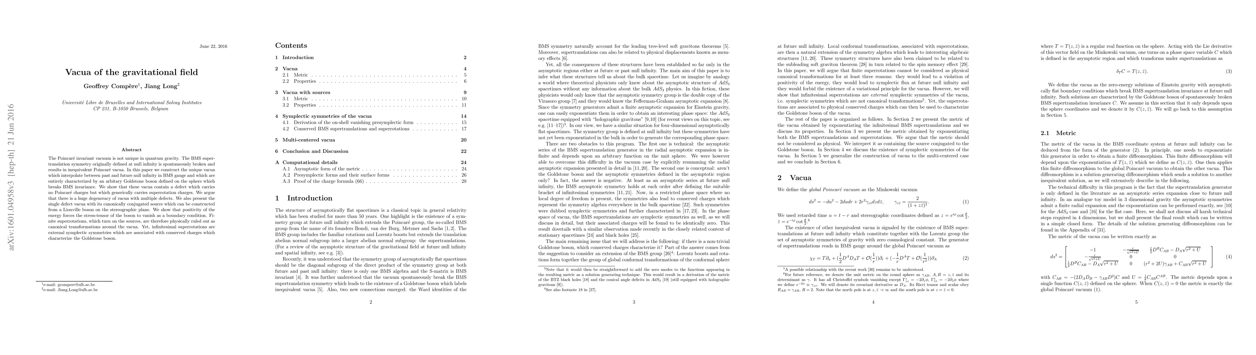 The Poincar\'e invariant vacuum is not unique in quantum gravity. The BMS supertranslation symmetry originally defined at null infinity is spontaneously broken and results in inequivalent Poincar\'e vacua. In this paper we construct the unique vacua which interpolate between past and future null infinity in BMS gauge and which are entirely characterized by an arbitary Goldstone boson defined on the sphere which breaks BMS invariance. We show that these vacua contain a defect which carries no Poincar\'e charges but which generically carries superrotation charges. We argue that there is a huge degeneracy of vacua with multiple defects. We also present the single defect vacua with its canonically conjugated source which can be constructed from a Liouville boson on the stereographic plane. We show that positivity of the energy forces the stress-tensor of the boson to vanish as a boundary condition. Finite superrotations, which turn on the sources, are therefore physically ruled out as canonical transformations around the vacua. Yet, infinitesimal superrotations are external symplectic symmetries which are associated with conserved charges which characterize the Goldstone boson.