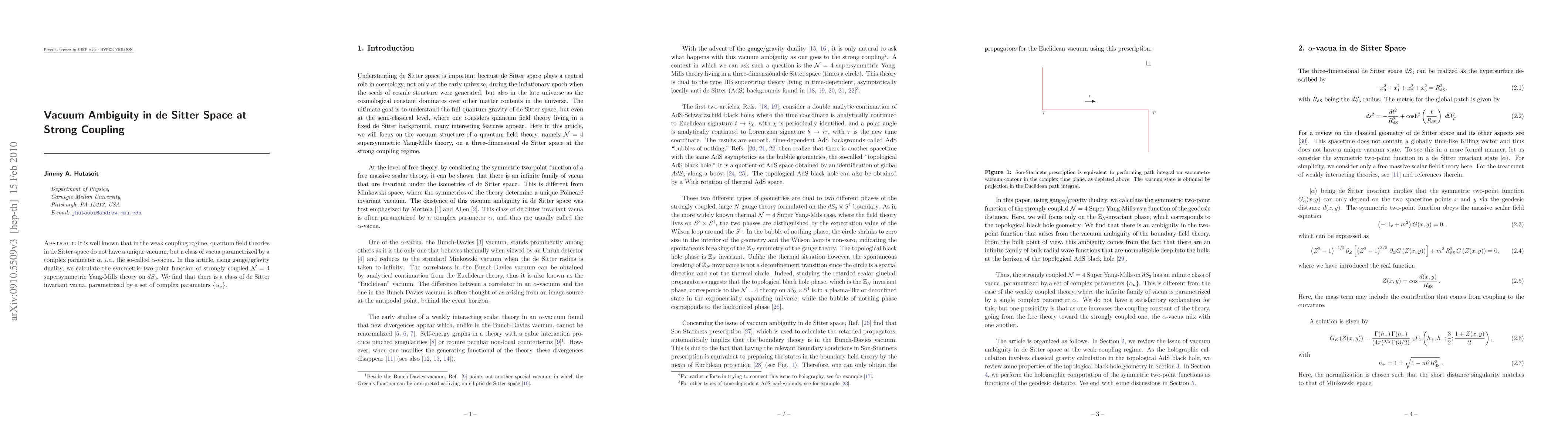 This paper investigates the vacuum ambiguity in de Sitter space at strong coupling, revealing that ${\cal N}=4$ supersymmetric Yang-Mills theory on $dS_3$ possesses a class of de Sitter invariant vacua, parametrized by complex parameters $\{\alpha_{\nu}\}$, using gauge/gravity duality.