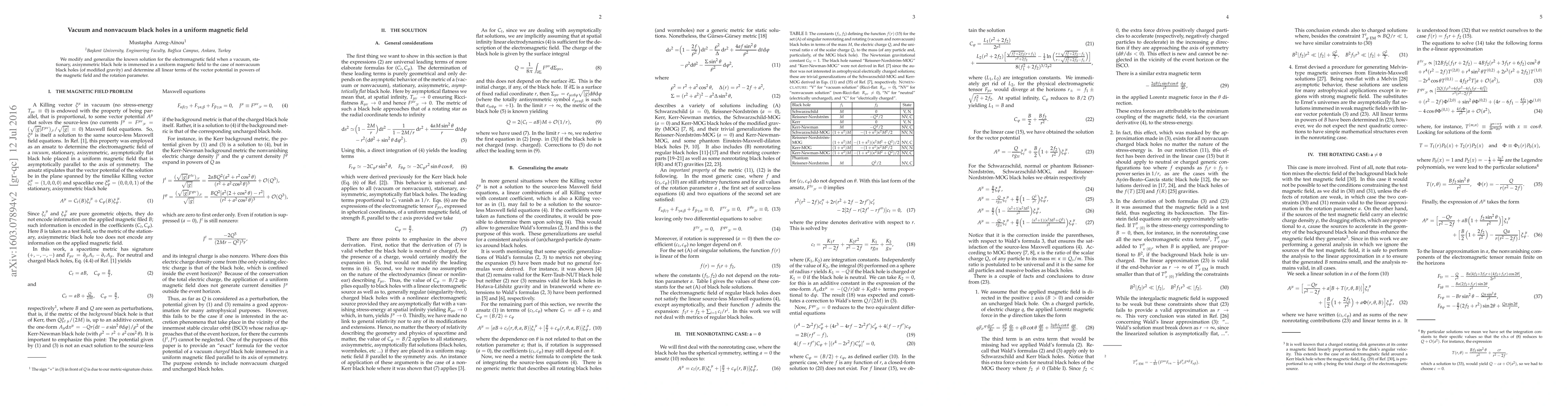 This paper extends the electromagnetic field solution for a vacuum black hole in a uniform magnetic field to nonvacuum black holes, focusing on modified gravity scenarios, and determines the linear terms of the vector potential in relation to the magnetic field and rotation parameters.