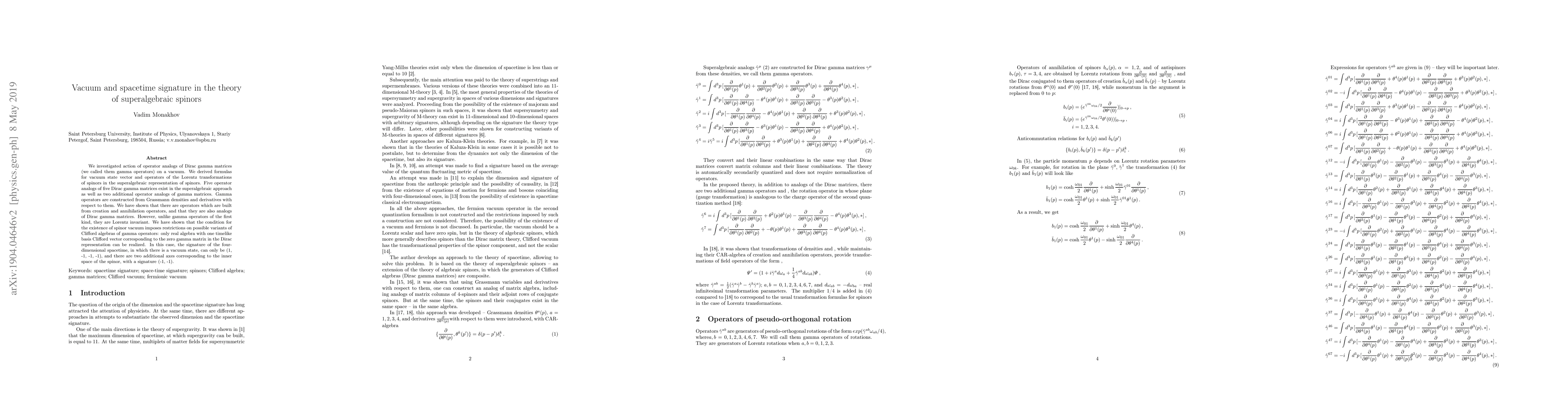 We investigated action of operator analogs of Dirac gamma matrices (we called them gamma operators) on a vacuum. We derived formulas for vacuum state vector and operators of the Lorentz transformations of spinors in the superalgebraic representation of spinors. Five operator analogs of five Dirac gamma matrices exist in the superalgebraic approach as well as two additional operator analogs of gamma matrices. Gamma operators are constructed from Grassmann densities and derivatives with respect to them. We have shown that there are operators which are built from creation and annihilation operators, and that they are also analogs of Dirac gamma matrices. However, unlike gamma operators of the first kind, they are Lorentz invariant. We have shown that the condition for the existence of spinor vacuum imposes restrictions on possible variants of Clifford algebras of gamma operators: only real algebra with one timelike basis Clifford vector corresponding to the zero gamma matrix in the Dirac representation can be realized. In this case, the signature of the four-dimensional spacetime, in which there is a vacuum state, can only be (1, -1, -1, -1), and there are two additional axes corresponding to the inner space of the spinor, with a signature (-1, -1).