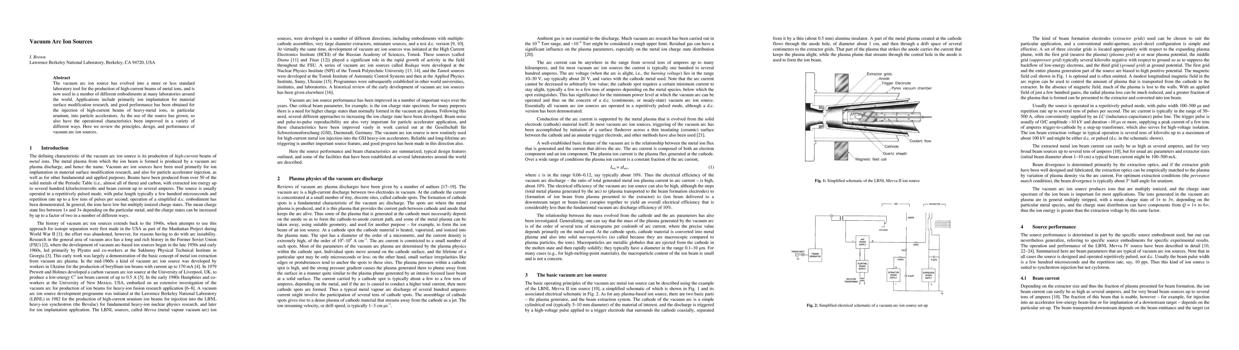 The vacuum arc ion source has evolved into a more or less standard laboratory tool for the production of high-current beams of metal ions, and is now used in a number of different embodiments at many laboratories around the world. Applications include primarily ion implantation for material surface modification research, and good performance has been obtained for the injection of high-current beams of heavy-metal ions, in particular uranium, into particle accelerators. As the use of the source has grown, so also have the operational characteristics been improved in a variety of different ways. Here we review the principles, design, and performance of vacuum arc ion sources.