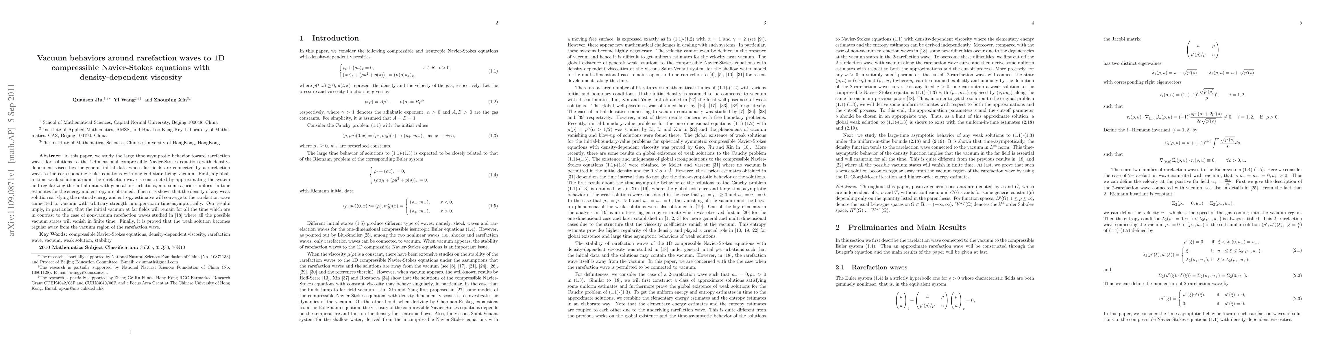 This paper constructs a global-in-time weak solution for the 1D compressible Navier-Stokes equations with density-dependent viscosities, showing that the density converges to a rarefaction wave connected to vacuum. It demonstrates that initial vacuum states remain indefinitely, contrasting with non-vacuum cases.
