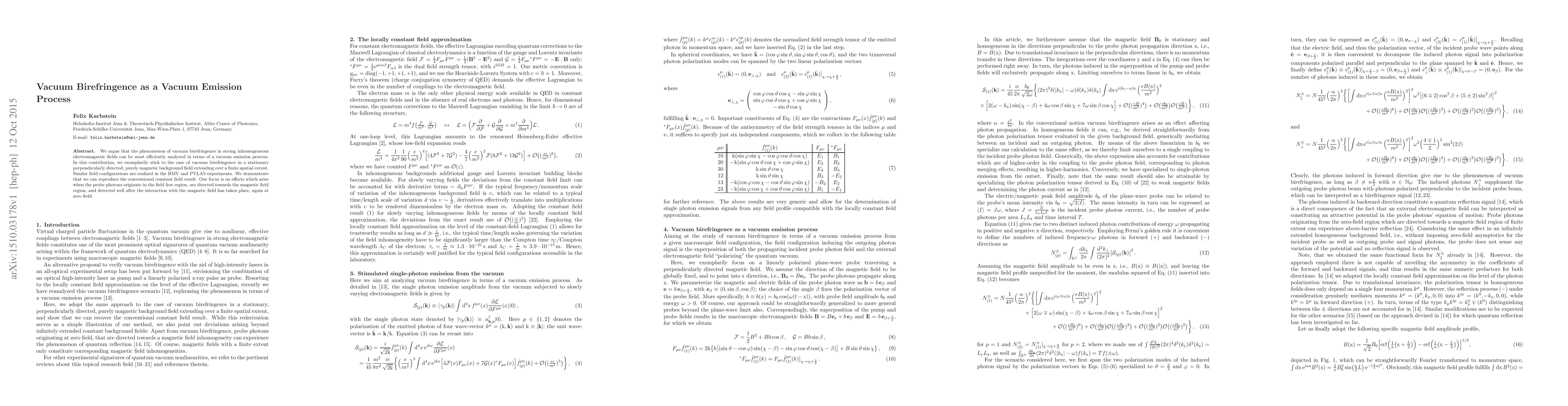 We argue that the phenomenon of vacuum birefringence in strong inhomogeneous electromagnetic fields can be most efficiently analyzed in terms of a vacuum emission process. In this contribution, we exemplarily stick to the case of vacuum birefringence in a stationary perpendicularly directed, purely magnetic background field extending over a finite spatial extent. Similar field configurations are realized in the BMV and PVLAS experiments. We demonstrate that we can reproduce the conventional constant field result. Our focus is on effects which arise when the probe photons originate in the field free region, are directed towards the magnetic field region, and detected well after the interaction with the magnetic field has taken place, again at zero field.