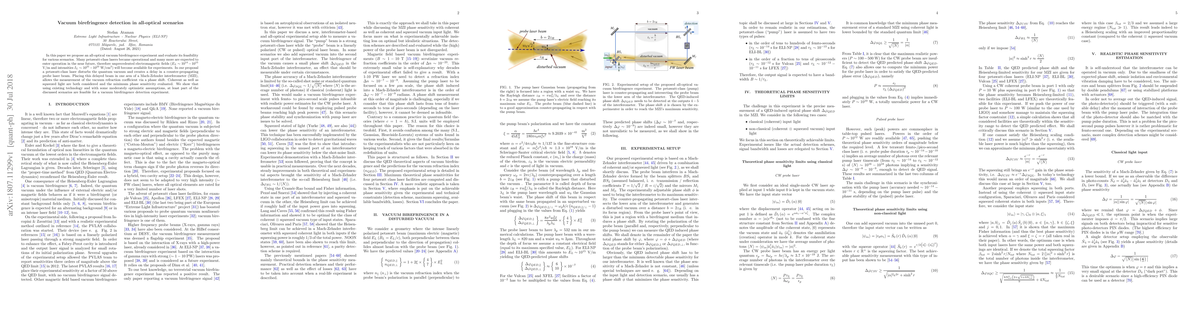 In this paper we propose an all-optical vacuum birefringence experiment and evaluate its feasibility for various scenarios. Many petawatt-class lasers became operational and many more are expected to enter operation in the near future, therefore unprecedented electromagnetic fields ($E_L\sim10^{14}-10^{15}$ V/m and intensities $I_L\sim10^{21}-10^{23}$ W/cm$^2$) will become available for experiments. In our proposal a petawatt-class laser disturbs the quantum vacuum and creates a delay in a counter-propagating probe laser beam. Placing this delayed beam in one arm of a Mach-Zehnder interferometer (MZI), allows the measurement of the vacuum refraction coefficient via a phase shift. Coherent as well as squeezed light are both considered and the minimum phase sensitivity evaluated. We show that using existing technology and with some moderately optimistic assumptions, at least part of the discussed scenarios are feasible for a vacuum birefringence detection experiment.