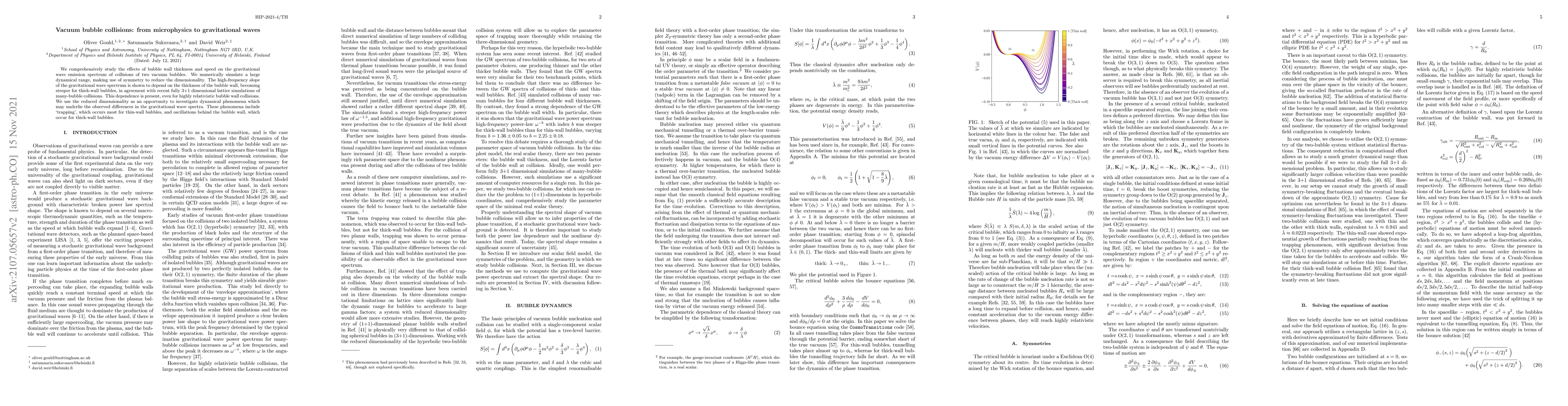 This paper investigates the gravitational wave emission from vacuum bubble collisions, finding that the high-frequency slope of the spectrum depends on bubble wall thickness, with thicker walls producing steeper slopes. It explores dynamic phenomena like 'trapping' and oscillations behind the bubble wall, using reduced dimensionality simulations to uncover these effects.
