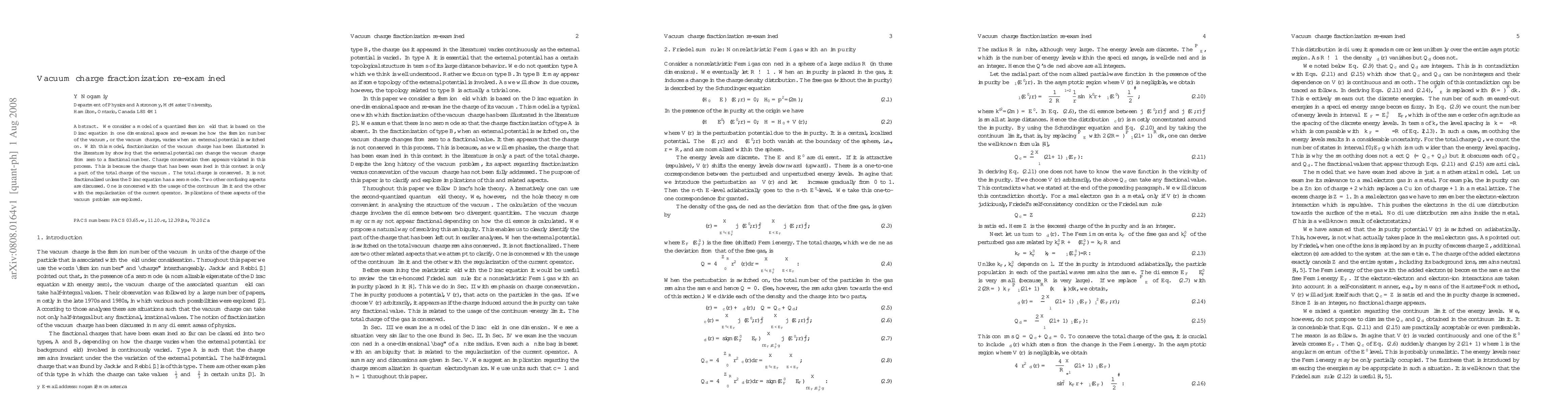 We consider a model of a quantized fermion field that is based on the Dirac equation in one dimensional space and re-examine how the fermion number of the vacuum, or the vacuum charge, varies when an external potential is switched on. With this model, fractionization of the vacuum charge has been illustrated in the literature by showing that the external potential can change the vacuum charge from zero to a fractional number. Charge conservation then appears violated in this process. This is because the charge that has been examined in this context is only a part of the total charge of the vacuum. The total charge is conserved. It is not fractionalized unless the Dirac equation has a zero mode. Two other confusing aspects are discussed. One is concerned with the usage of the continuum limit and the other with the regularization of the current operator. Implications of these aspects of the vacuum problem are explored.