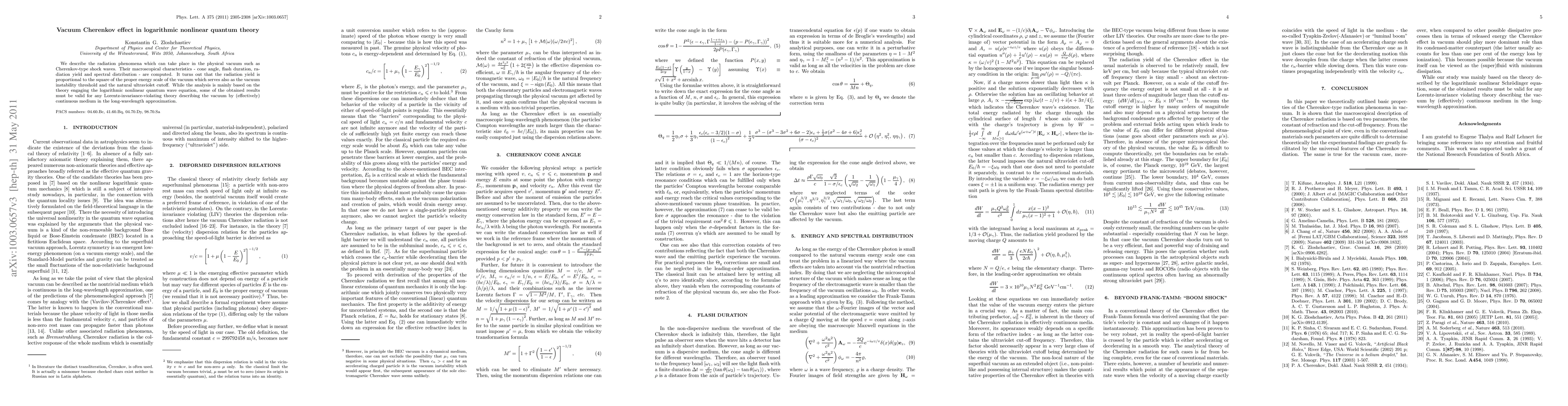 We describe the radiation phenomena which can take place in the physical vacuum such as Cherenkov-type shock waves. Their macroscopical characteristics - cone angle, flash duration, radiation yield and spectral distribution - are computed. It turns out that the radiation yield is proportional to the square of the proper energy scale of the vacuum which serves also as the vacuum instability threshold and the natural ultraviolet cutoff. While the analysis is mainly based on the theory engaging the logarithmic nonlinear quantum wave equation, some of the obtained results must be valid for any Lorentz-invariance-violating theory describing the vacuum by (effectively) continuous medium in the long-wavelength approximation.