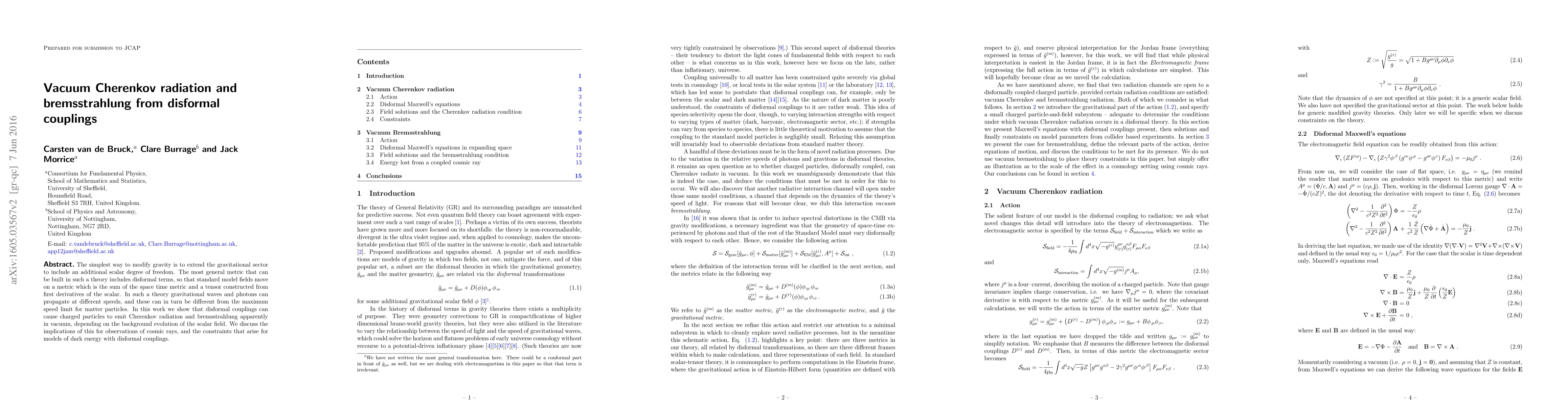 The simplest way to modify gravity is to extend the gravitational sector to include an additional scalar degree of freedom. The most general metric that can be built in such a theory includes disformal terms, so that standard model fields move on a metric which is the sum of the space time metric and a tensor constructed from first derivatives of the scalar. In such a theory gravitational waves and photons can propagate at different speeds, and these can in turn be different from the maximum speed limit for matter particles. In this work we show that disformal couplings can cause charged particles to emit Cherenkov radiation and bremsstrahlung apparently in vacuum, depending on the background evolution of the scalar field. We discuss the implications of this for observations of cosmic rays, and the constraints that arise for models of dark energy with disformal couplings.