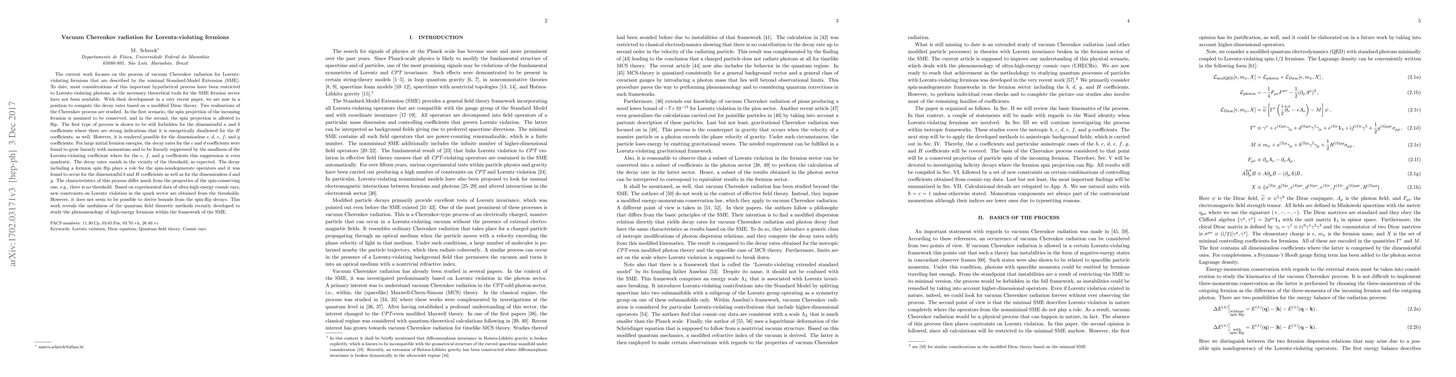 The current work focuses on the process of vacuum Cherenkov radiation for Lorentz-violating fermions that are described by the minimal Standard-Model Extension (SME). To date, most considerations of this important hypothetical process have been restricted to Lorentz-violating photons, as the necessary theoretical tools for the SME fermion sector have not been available. With their development in a very recent paper, we are now in a position to compute the decay rates based on a modified Dirac theory. Two realizations of the Cherenkov process are studied. In the first scenario, the spin projection of the incoming fermion is assumed to be conserved, and in the second, the spin projection is allowed to flip. The first type of process is shown to be still forbidden for the dimensionful $a$ and $b$ coefficients where there are strong indications that it is energetically disallowed for the $H$ coefficients, as well. However, it is rendered possible for the dimensionless $c$, $d$, $e$, $f$, and $g$ coefficients. For large initial fermion energies, the decay rates for the $c$ and $d$ coefficients were found to grow linearly with momentum and to be linearly suppressed by the smallness of the Lorentz-violating coefficient where for the $e$, $f$, and $g$ coefficients this suppression is even quadratic. The decay rates vanish in the vicinity of the threshold, as expected. The decay including a fermion spin flip plays a role for the spin-nondegenerate operators and it was found to occur for the dimensionful $b$ and $H$ coefficients as well as for the dimensionless $d$ and $g$. The characteristics of this process differ much from the properties of the spin-conserving one, e.g., there is no threshold. Based on experimental data of ultra-high-energy cosmic rays, new constraints on Lorentz violation in the quark sector are obtained from the thresholds.