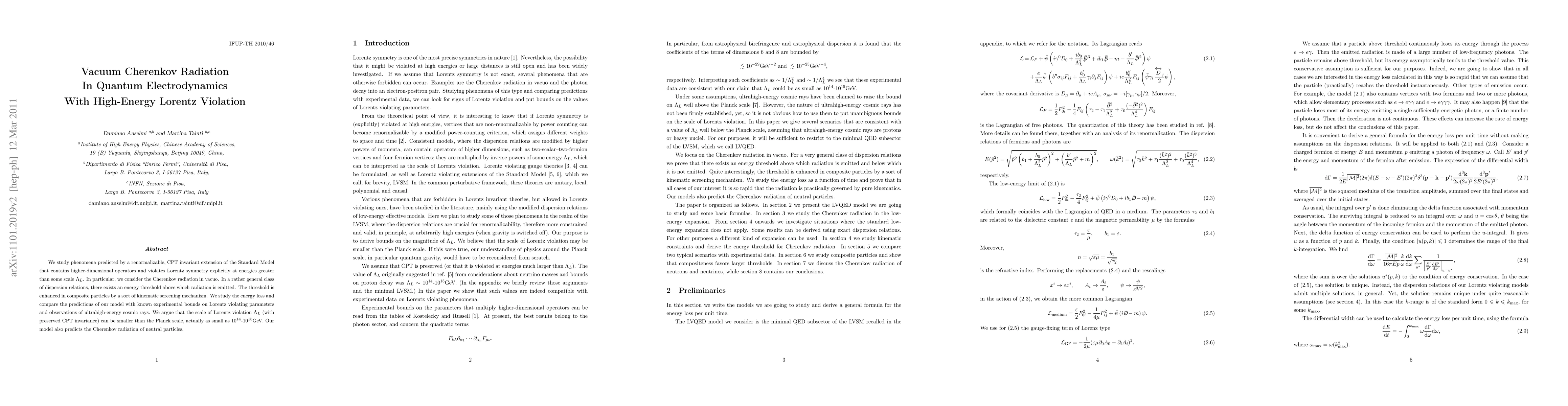 This paper investigates Cherenkov radiation in a modified quantum electrodynamics model that explicitly violates Lorentz symmetry at high energies, proposing a threshold for vacuum radiation. The study suggests that the scale of Lorentz violation can be as low as 10^{14}-10^{15} GeV, potentially observable in ultrahigh-energy cosmic rays.