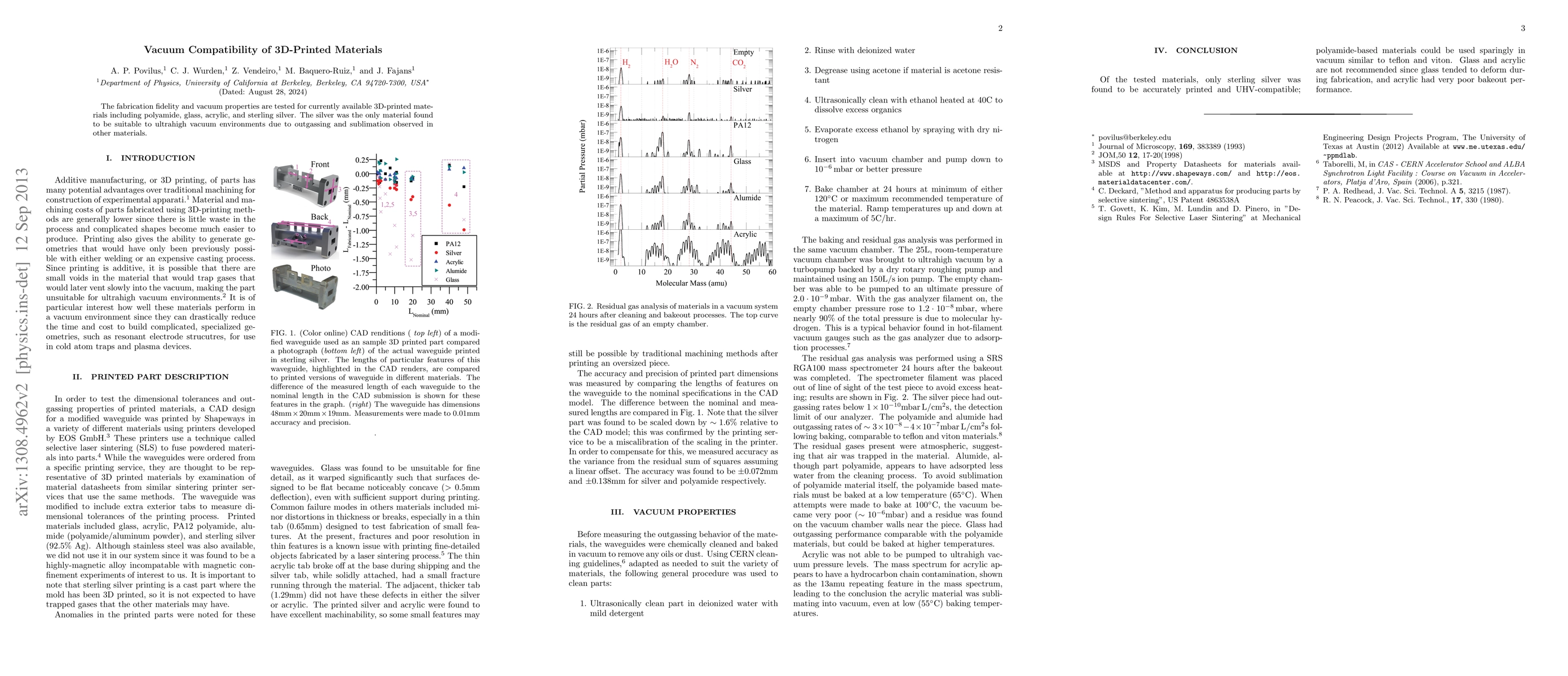 Summary: This study evaluates the vacuum compatibility of various 3D-printed materials, finding that only sterling silver maintains fabrication fidelity in ultrahigh vacuum conditions, while others suffer from outgassing and sublimation.