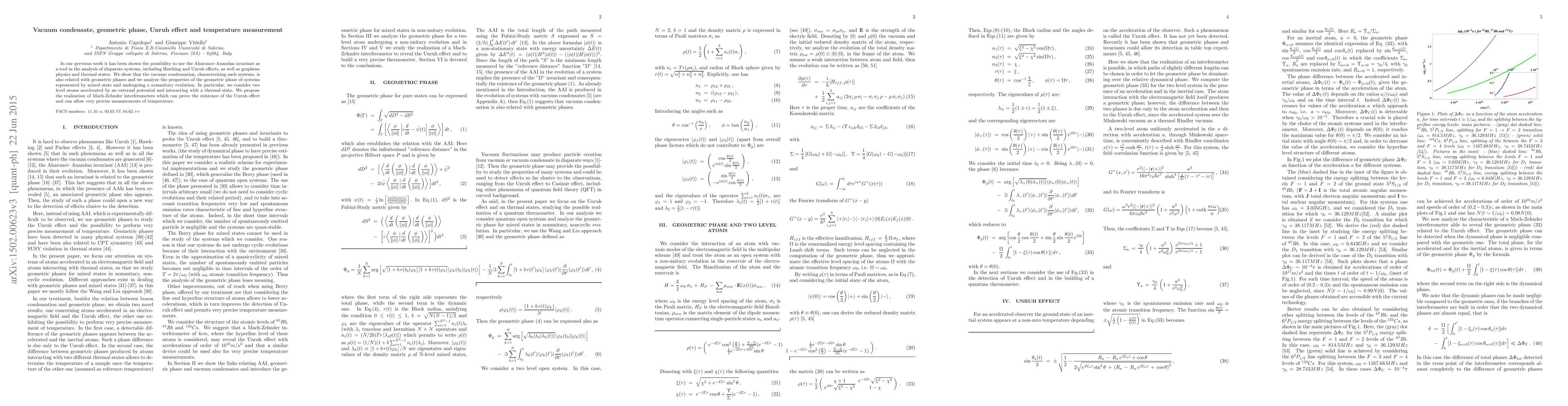 This paper explores the connection between vacuum condensation, geometric phase, and the Unruh effect, demonstrating how the Aharonov-Anandan invariant can analyze these phenomena. It proposes using Mach-Zehnder interferometers to verify the Unruh effect and achieve precise temperature measurements.