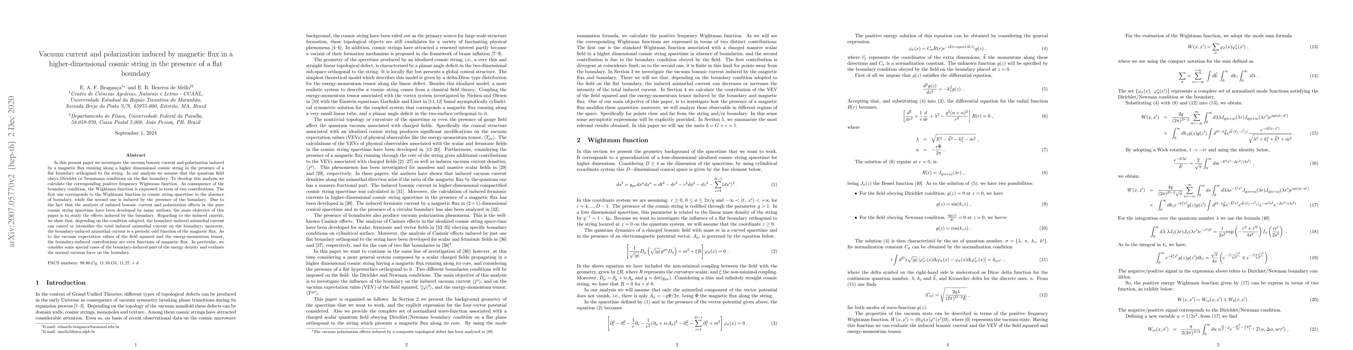 In this paper we analyze the vacuum bosonic current and polarization induced by a magnetic flux running along a higher dimensional cosmic string in the presence of a flat boundary orthogonal to the string. In our analysis we assume that the quantum field obeys Dirichlet or Neunmann conditions on the flat boundary. In order to develop this analysis we calculate the corresponding Wightman function. As consequence of the boundary, the Wightamn function is expressed in term of two contributions: The first one corresponds to the boundary-free cosmic string Wightman function, while the second one is induced by the boundary. The boundary-induced contributions have opposite signs for Dirichlet and Newman scalars. Because the analysis of vacuum current and polarization effects in the boundary-free cosmic string spacetime have been developed in the literature, here we are mainly interested in the calculations of the effects induced by the boundary. Regarding to the induced current, we show that, depending on the condition adopted, the boundary-induced azimuthal current can cancel or intensifies the total induced azimuthal current on the boundary; moreover, the boundary-induced azimuthal current is a periodic odd function of the magnetic flux. As to the vacuum expectation values of the field squared and the energy-momentum tensor, the boundary-induced contributions are even functions of magnetic flux. In particular, we consider some special cases of the boundary-induced part of the energy density and evaluate the normal vacuum force on the boundary.