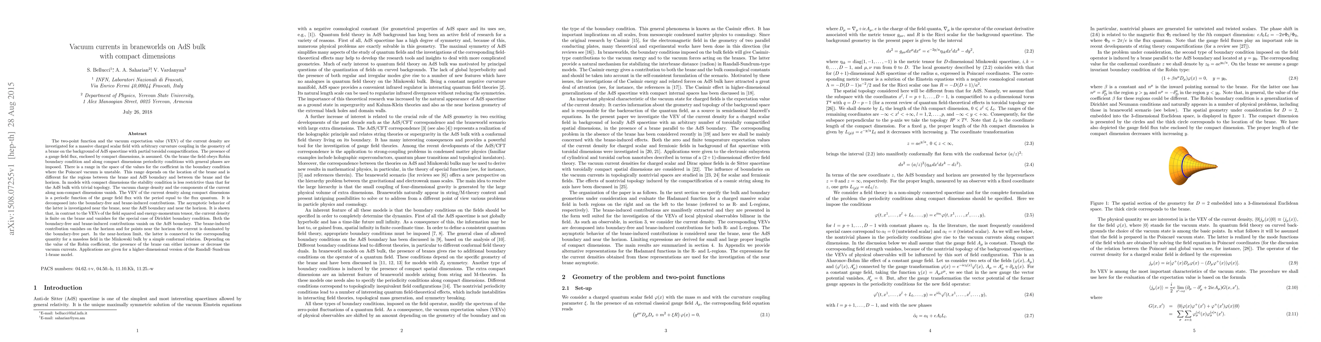 This paper investigates vacuum currents in braneworlds on an AdS bulk with compact dimensions, focusing on a massive charged scalar field. It finds that the vacuum current density is finite on the brane and varies with the gauge field flux, showing stability conditions less restrictive than in AdS bulk with trivial topology.