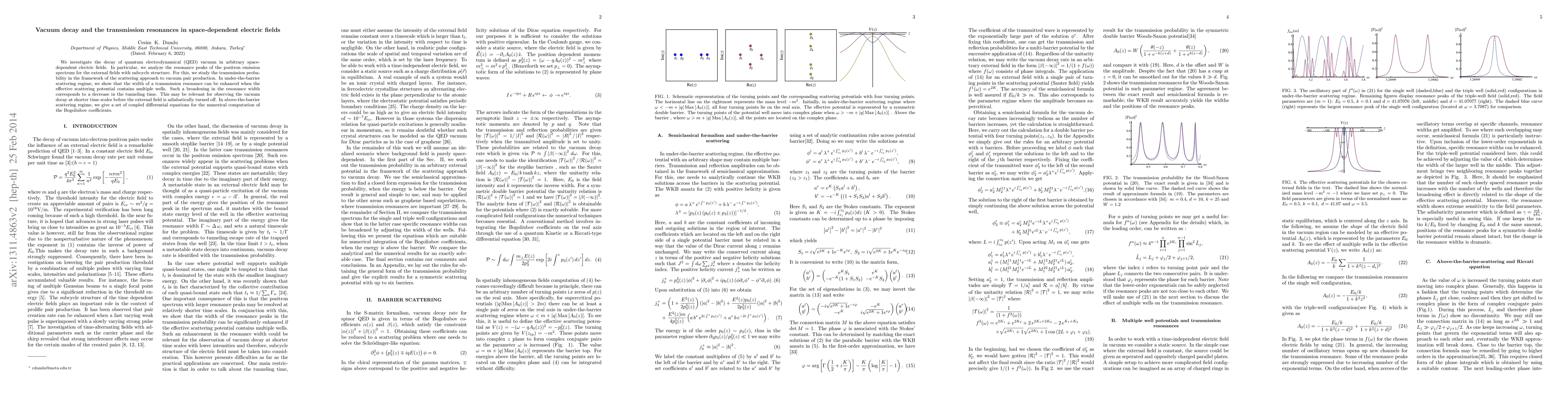 We investigate the decay of quantum electrodynamical (QED) vacuum in arbitrary space-dependent electric fields. In particular, we analyze the resonance peaks of the positron emission spectrum for the external fields with subcycle structure. For this, we study the transmission probability in the framework of scattering approach to vacuum pair production. In under-the-barrier scattering regime, we show that the width of a transmission resonance can be enhanced when the effective scattering potential contains multiple wells. Such a broadening in the resonance width corresponds to a decrease in the tunneling time. This may be relevant for observing the vacuum decay at shorter timescales before the external field is adiabatically turned off. In above-the-barrier scattering regime, we give a set of coupled differential equations for the numerical computation of the Bogoliubov coefficients.