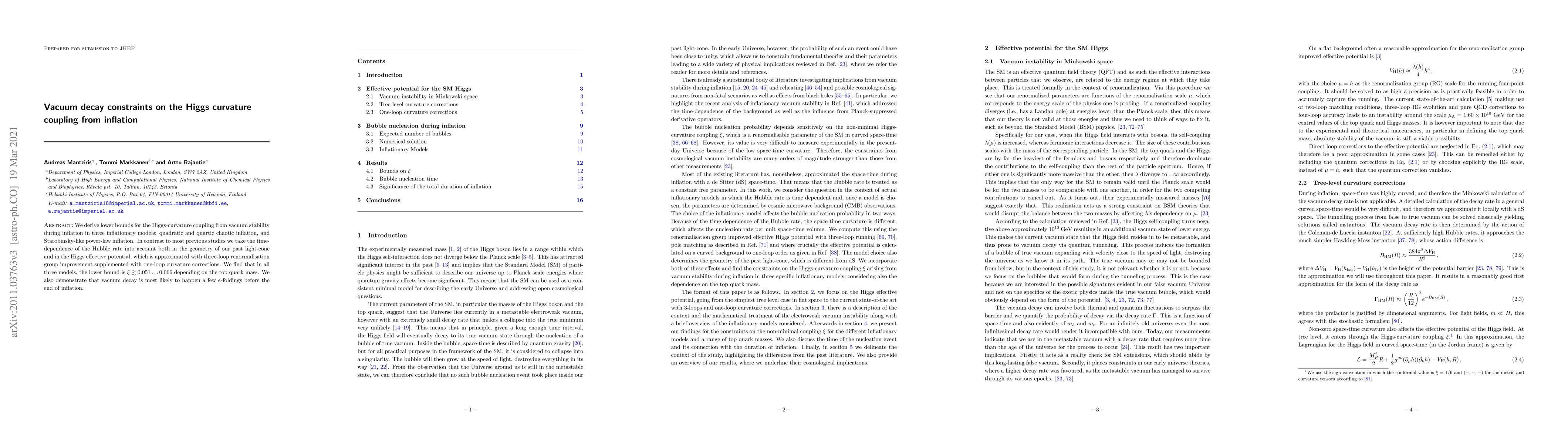 This paper derives lower bounds for the Higgs-curvature coupling ($\xi$) during inflation in three models, accounting for the time-dependence of the Hubble rate and employing advanced renormalization techniques. The study finds $\xi \gtrsim 0.051\ldots 0.066$, depending on the top quark mass, and suggests vacuum decay is likely to occur close to the end of inflation.