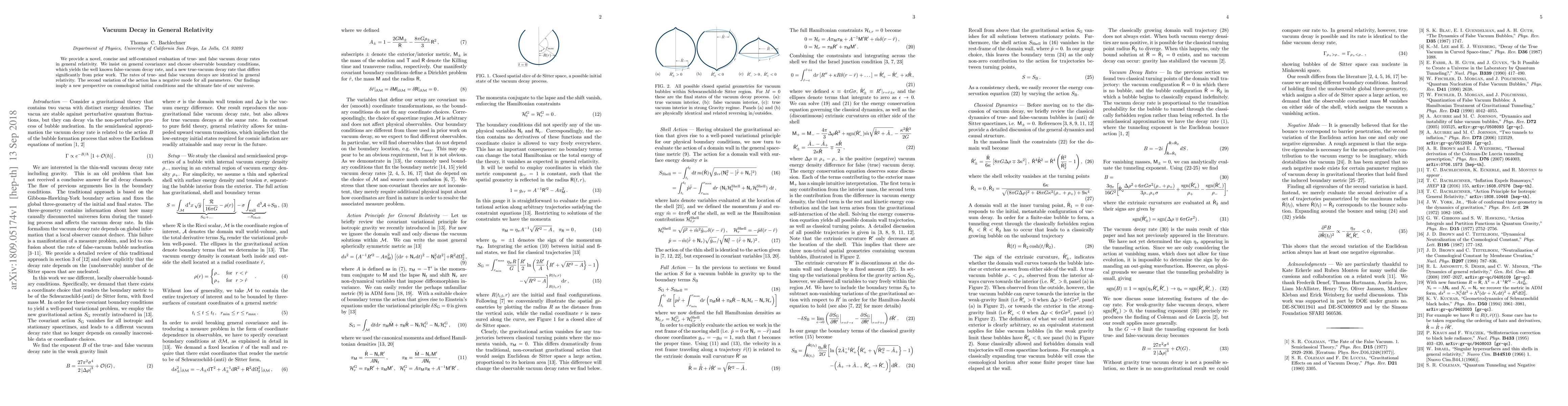 The paper introduces a novel approach to vacuum decay analysis in general relativity, utilizing general covariance and observable boundary conditions, leading to new true-vacuum decay rate expressions.