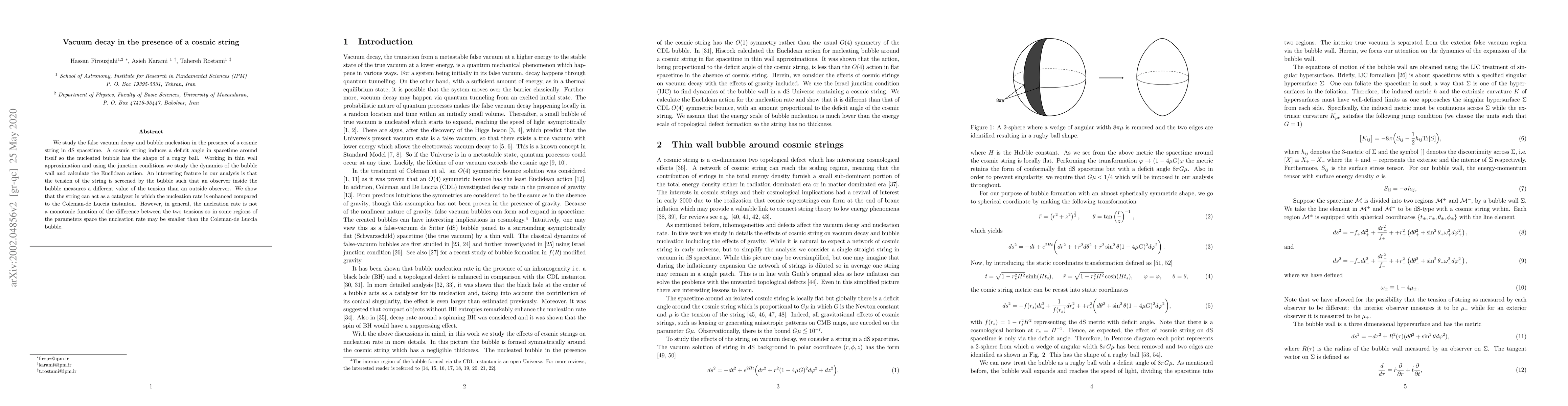 We study the false vacuum decay and bubble nucleation in the presence of a cosmic string in dS spacetime. A cosmic string induces a deficit angle in spacetime around itself so the nucleated bubble has the shape of a rugby ball. Working in thin wall approximation and using the junction conditions we study the dynamics of the bubble wall and calculate the Euclidean action. An interesting feature in our analysis is that the tension of the string is screened by the bubble such that an observer inside the bubble measures a different value of the tension than an outside observer. We show that the string can act as a catalyzer in which the nucleation rate is enhanced compared to the Coleman-de Luccia instanton. However, in general, the nucleation rate is not a monotonic function of the difference between the two tensions so in some regions of the parameters space the nucleation rate may be smaller than the Coleman-de Luccia bubble.