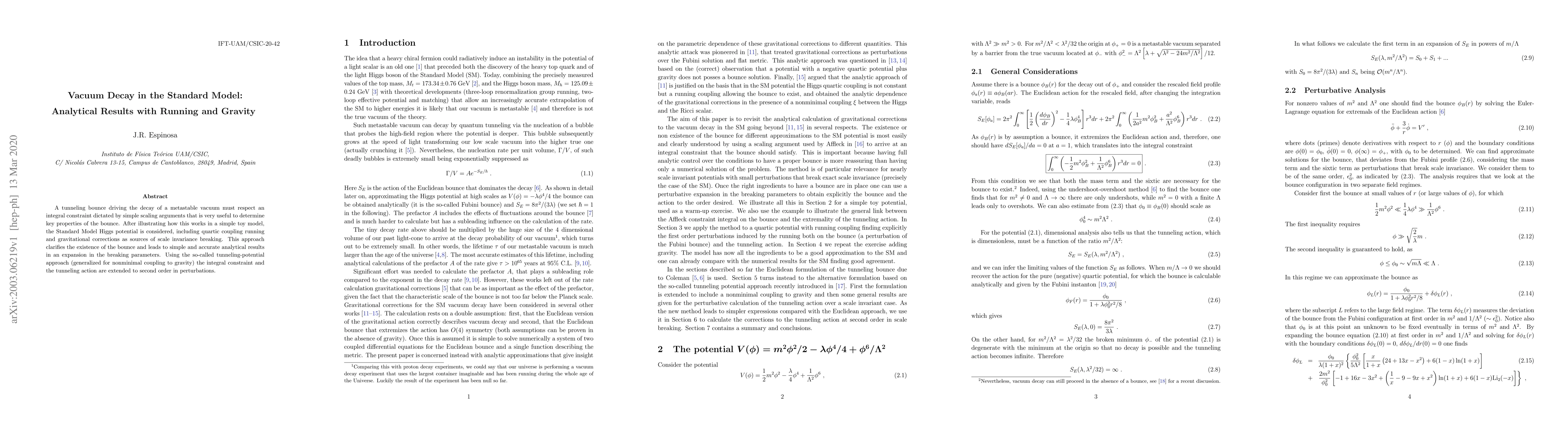 A tunneling bounce driving the decay of a metastable vacuum must respect an integral constraint dictated by simple scaling arguments that is very useful to determine key properties of the bounce. After illustrating how this works in a simple toy model, the Standard Model Higgs potential is considered, including quartic coupling running and gravitational corrections as sources of scale invariance breaking. This approach clarifies the existence of the bounce and leads to simple and accurate analytical results in an expansion in the breaking parameters. Using the so-called tunneling-potential approach (generalized for nonminimal coupling to gravity) the integral constraint and the tunneling action are extended to second order in perturbations.